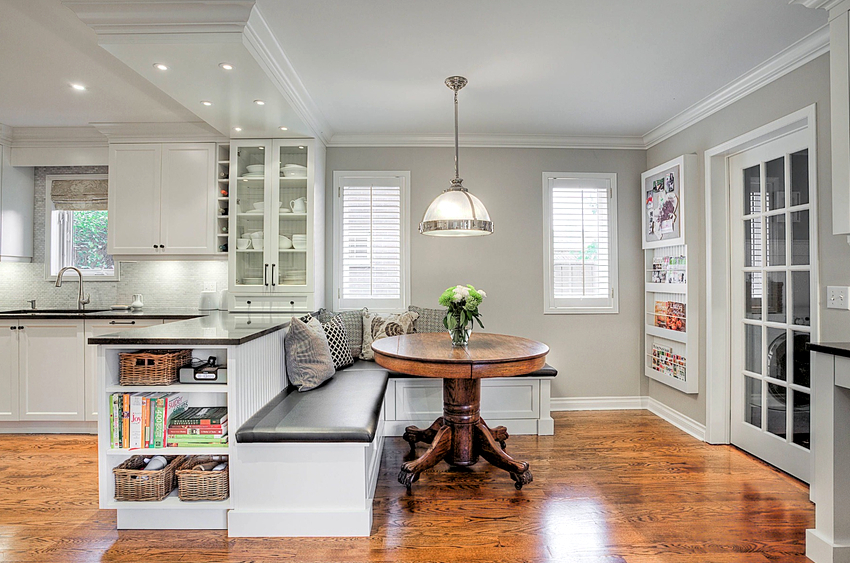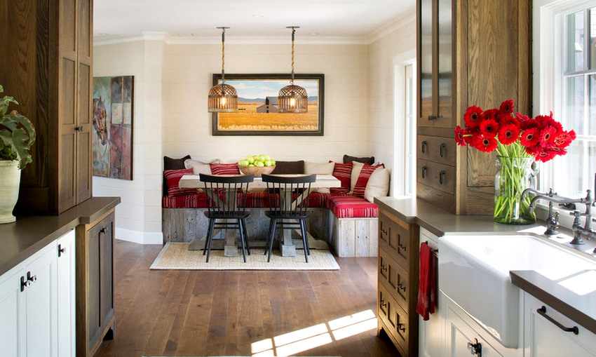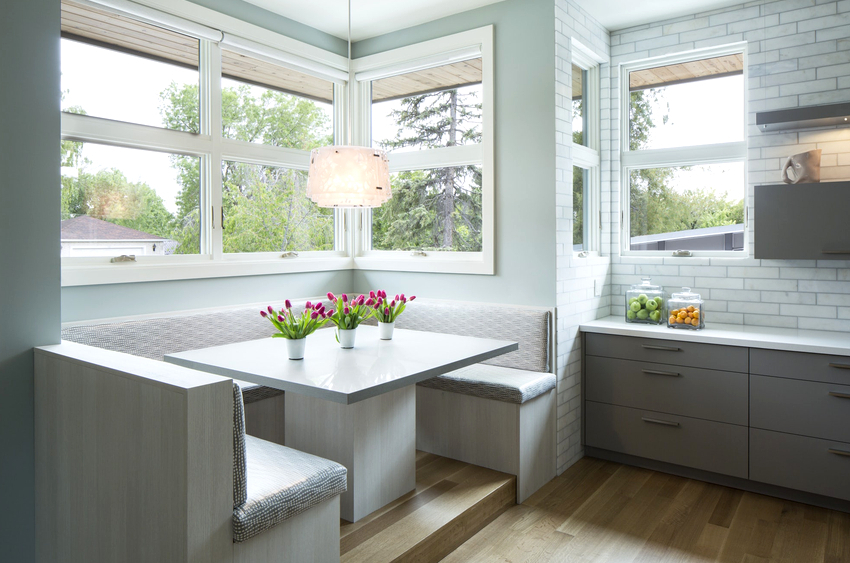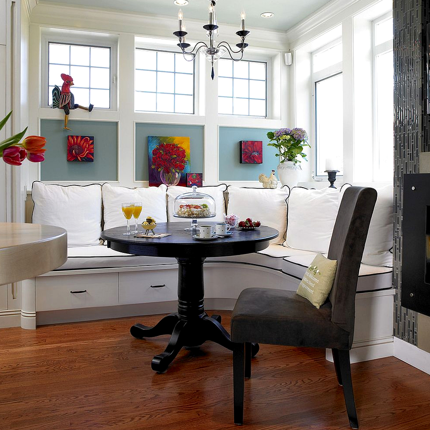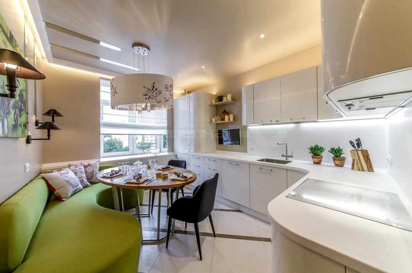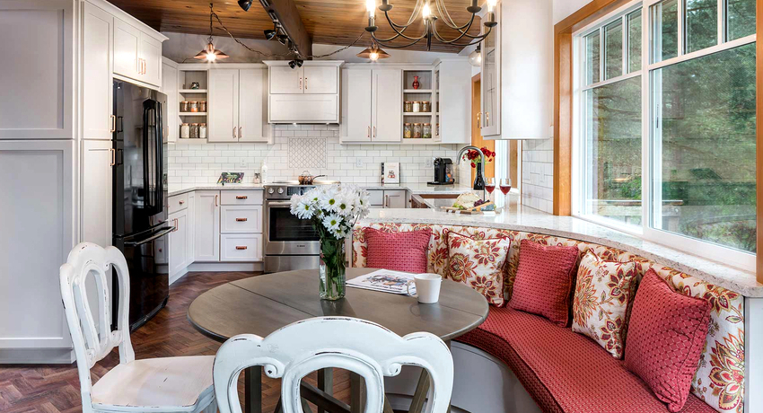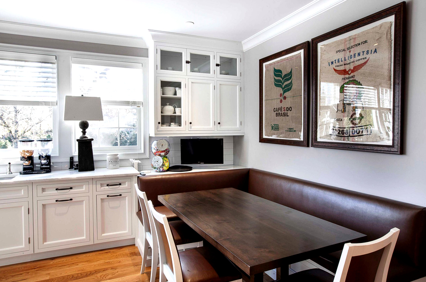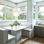 If your kitchen has a bay window, you can't think of a better place for a corner sofa. This area is ideal for setting up a compact dining room.