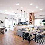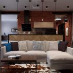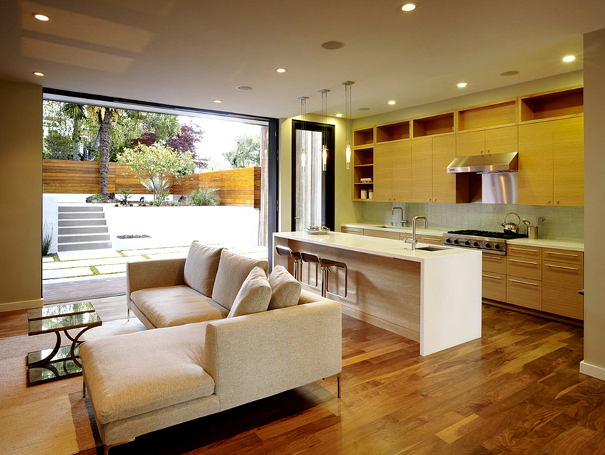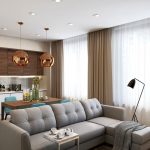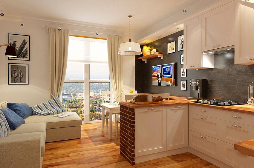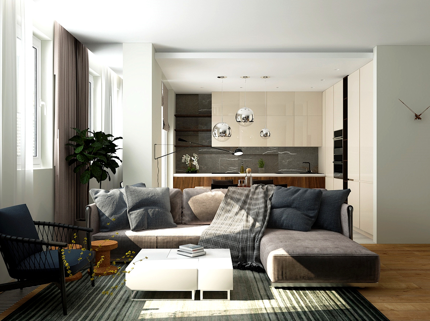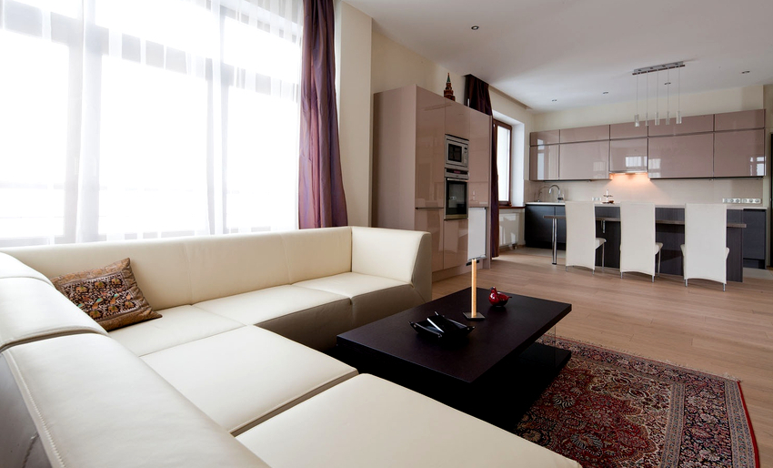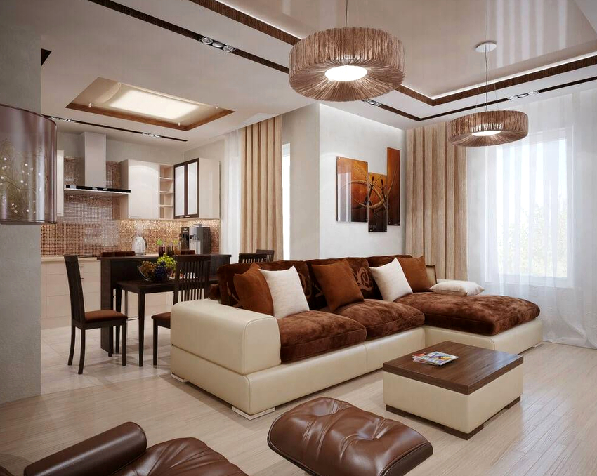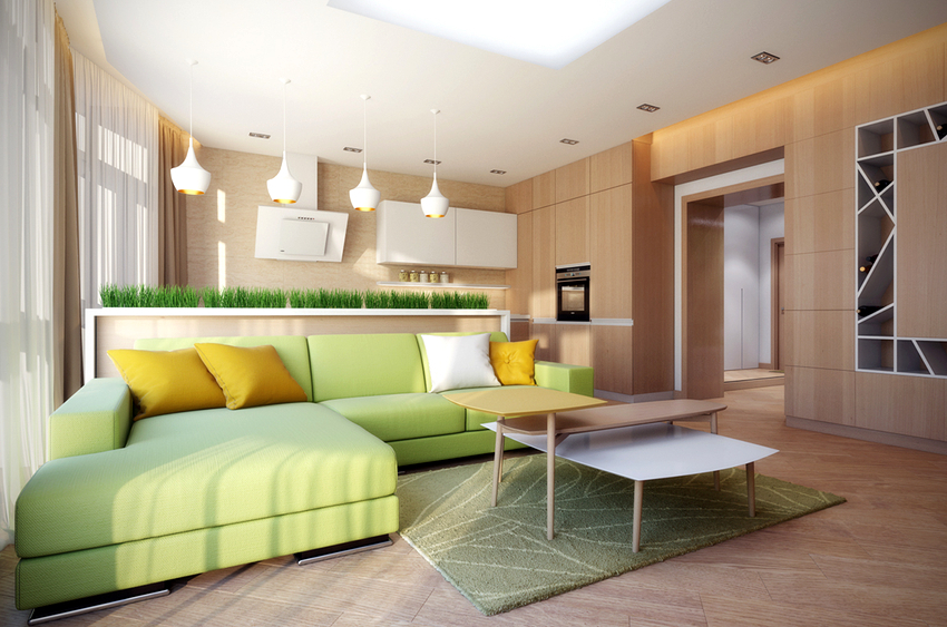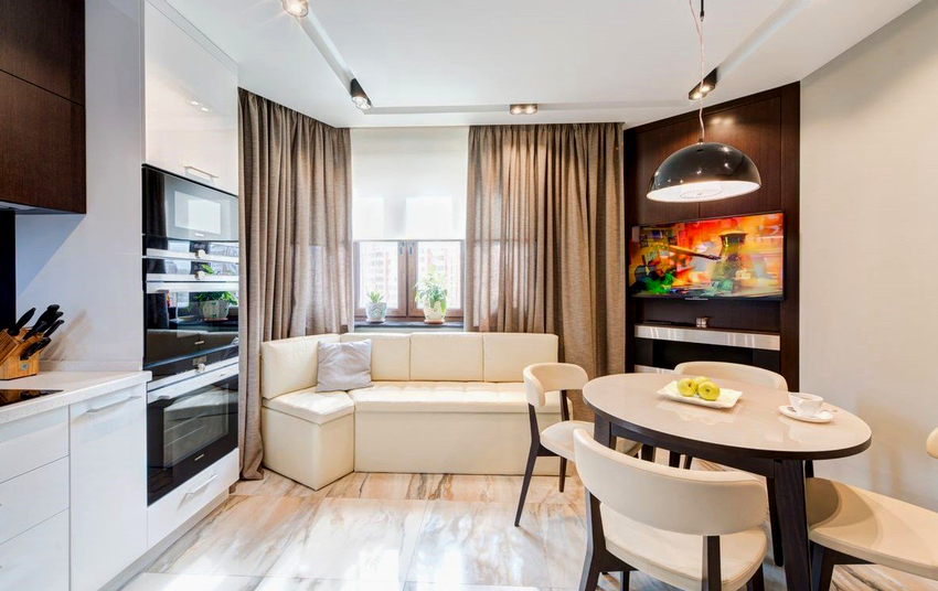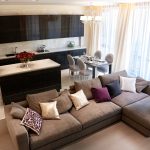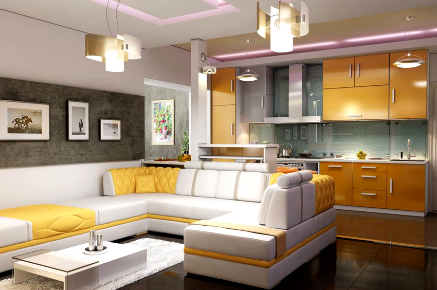 Owners of spacious kitchens and living rooms may not even be tormented by the question of where to put the sofa.It can be placed in the middle of the room with its back to the workplace, thereby dividing the room into two functional zones.