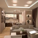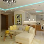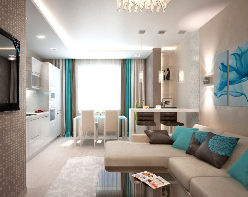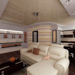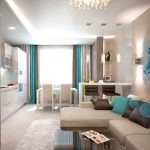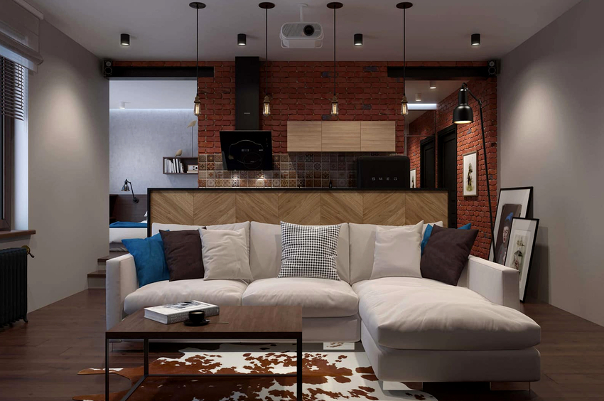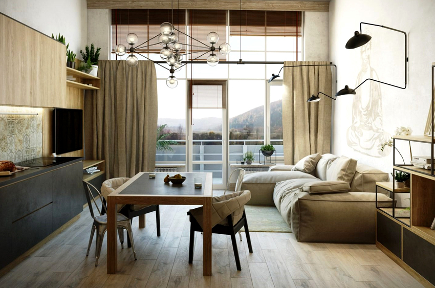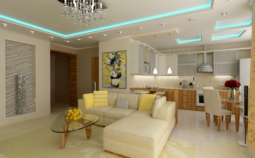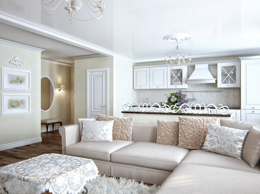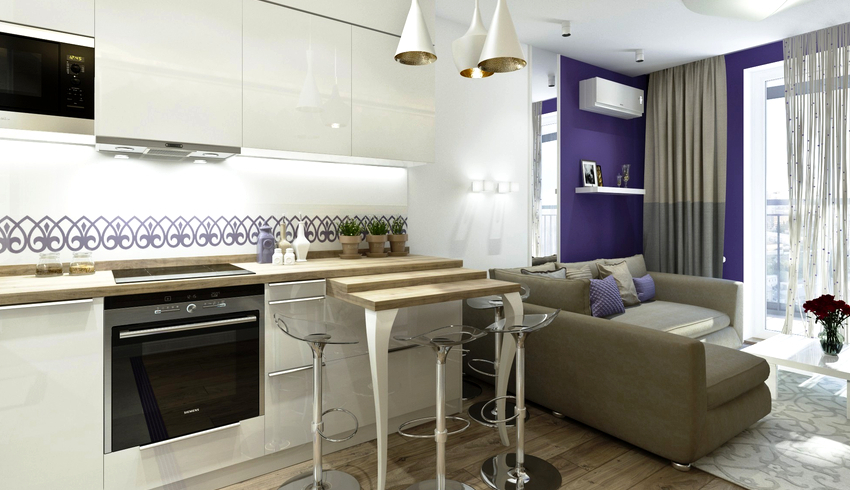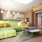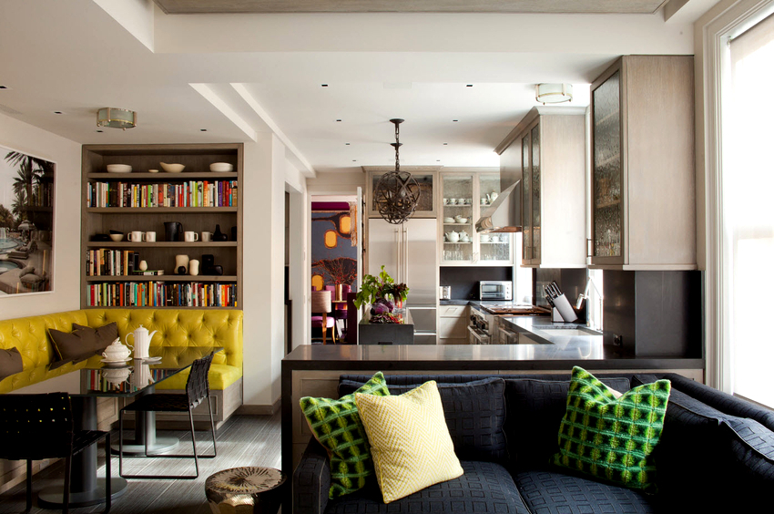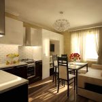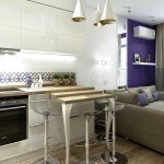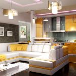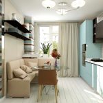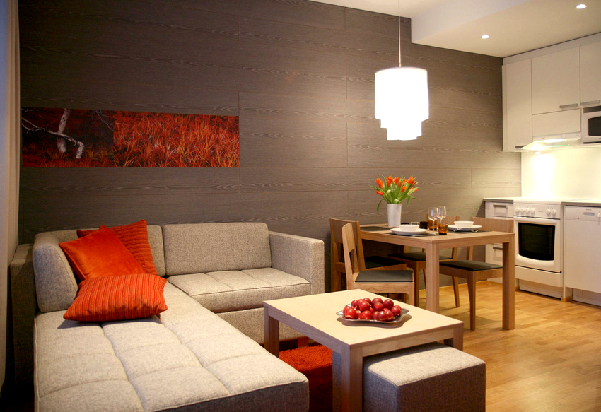 The open method does not provide for the presence of partitions. The sofa is installed immediately behind the headset. If there is very little space, you can beat the previously described option for the dining area: the sofa is built on pedestals, which are part of the kitchen set.