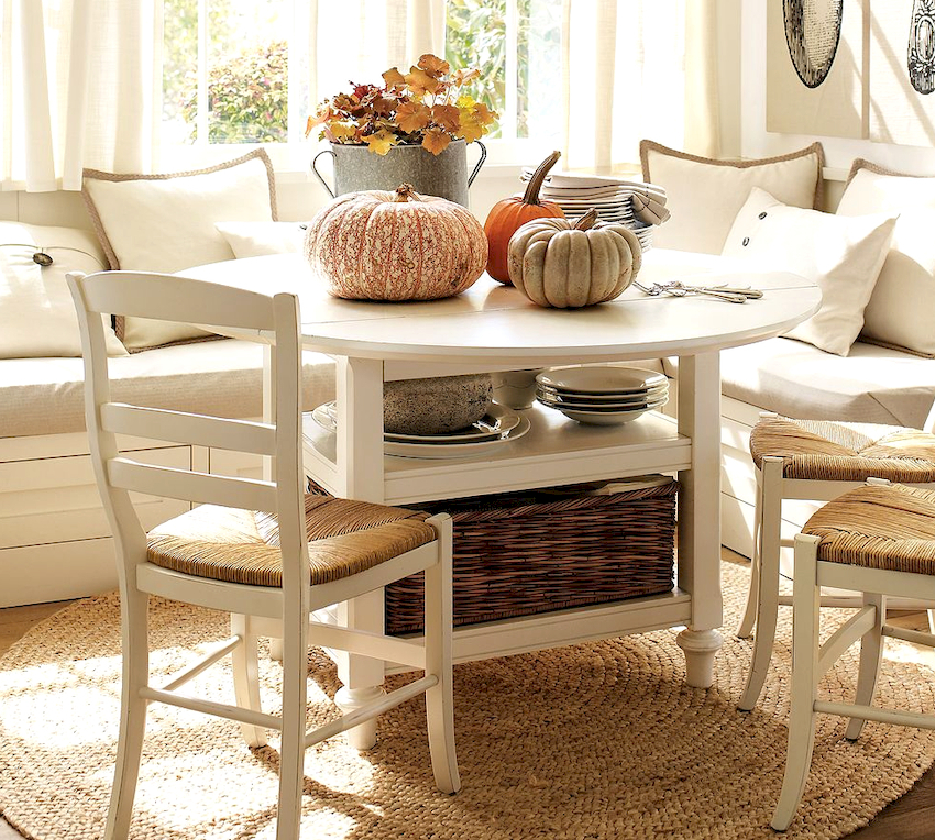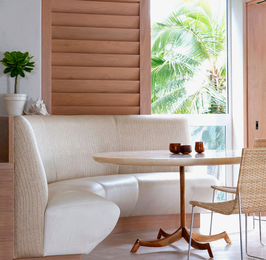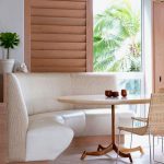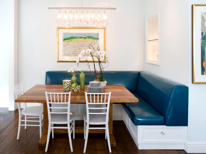 Helpful advice! Most sofa benches have a rounded shape. The corner part of these products looks like a flat shelf. To provide enough seating in the kitchen, it is advisable to purchase a round dining table.