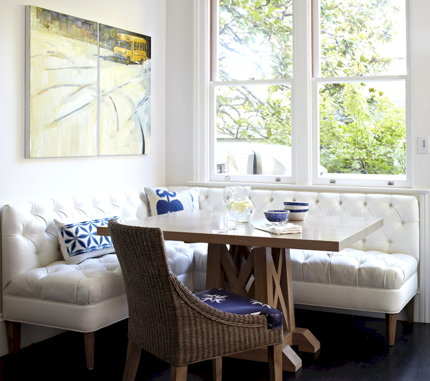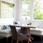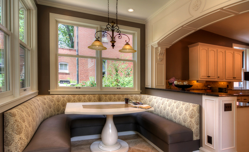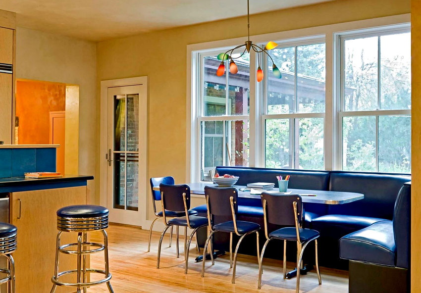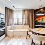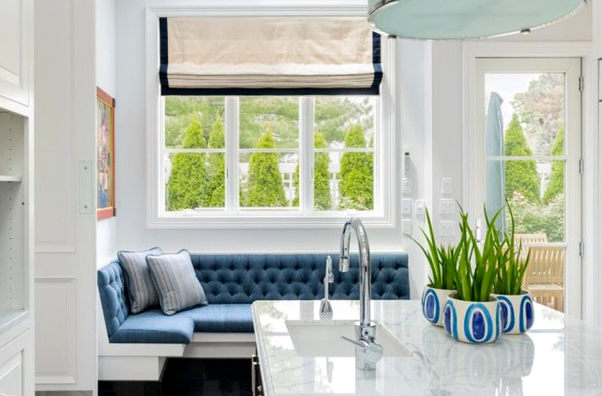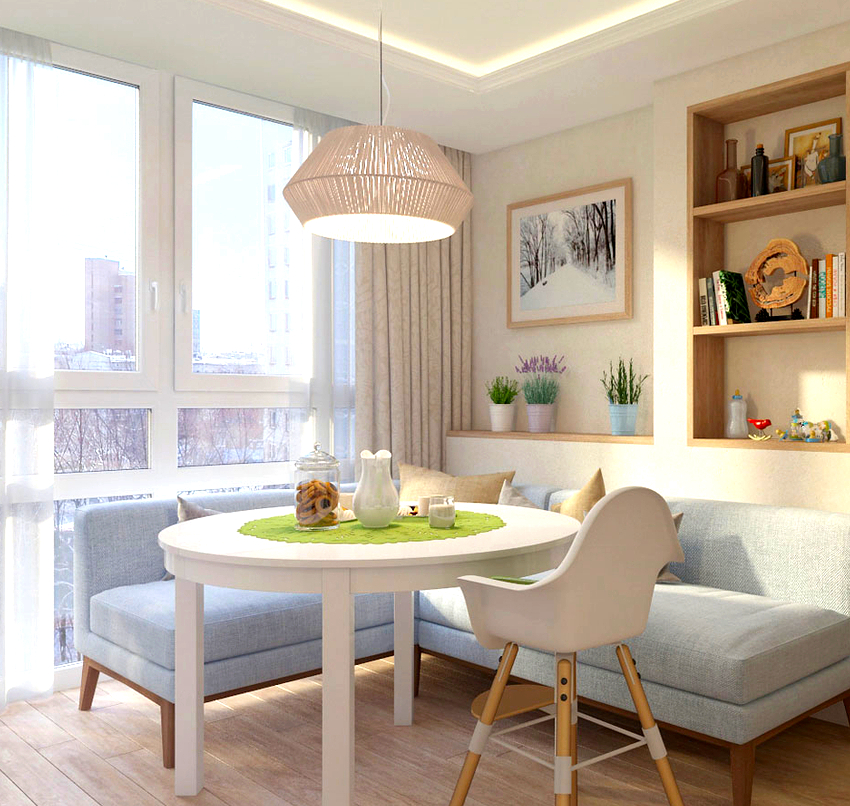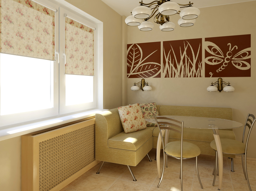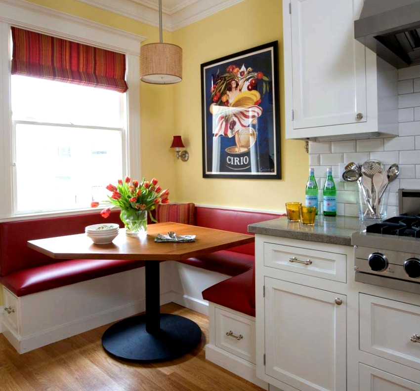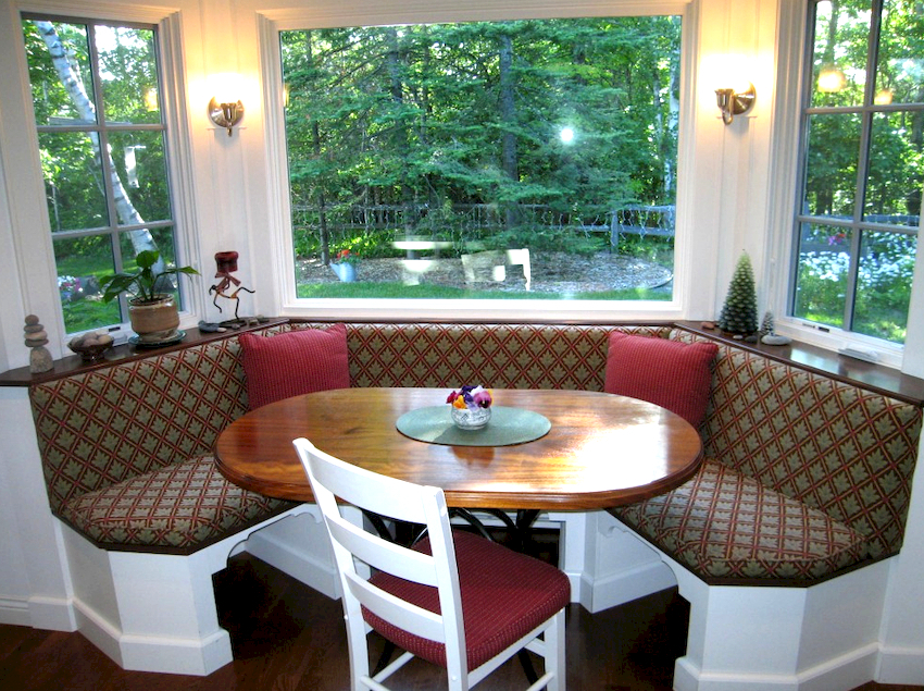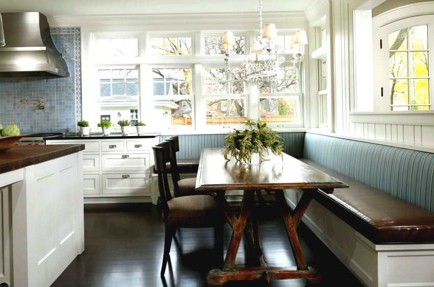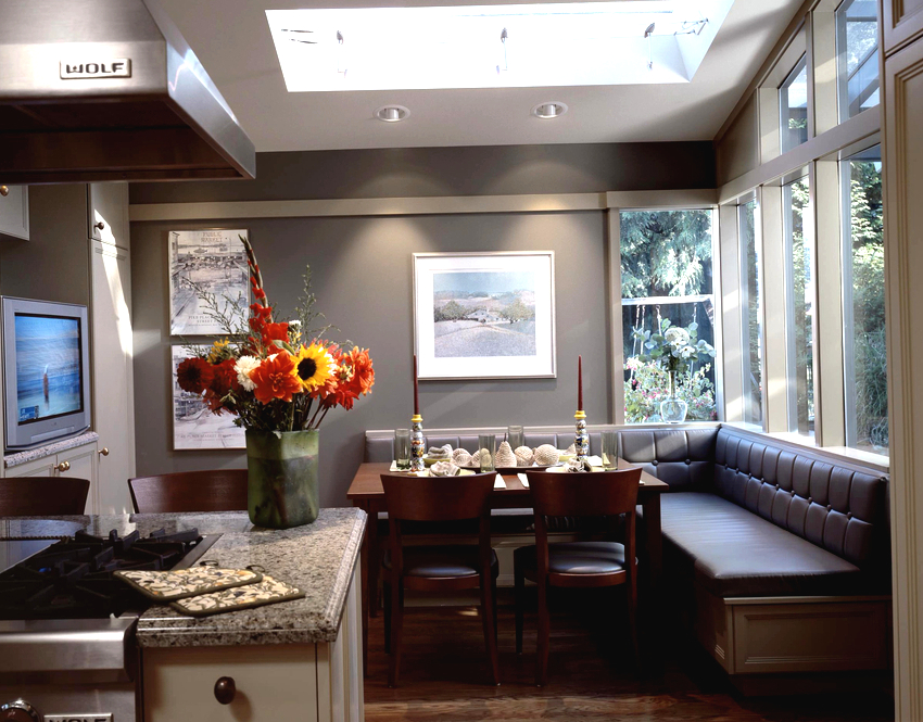 An excellent option for arranging a recreation area in the kitchen would be a sofa with a bay window structure. However, it will be very difficult to find the right size model. It is better to order the manufacture of a bay window sofa from the manufacturer. In this case, the product will have the required dimensions, and its configuration will correspond to the layout of the room. Seating areas with such sofas turn out to be cozy and light.