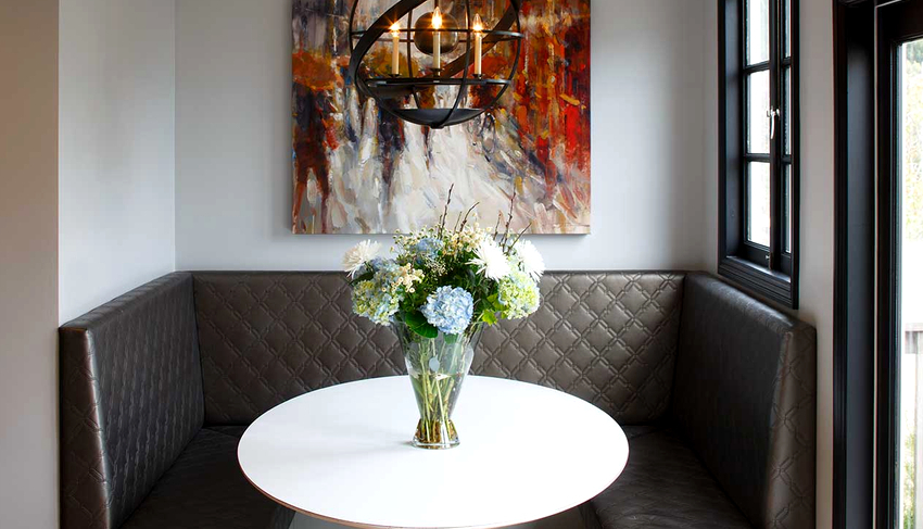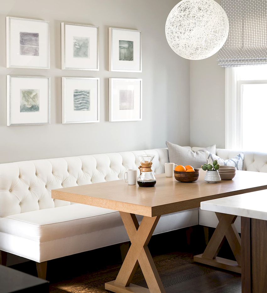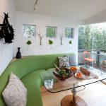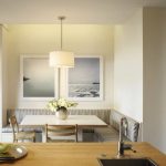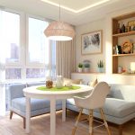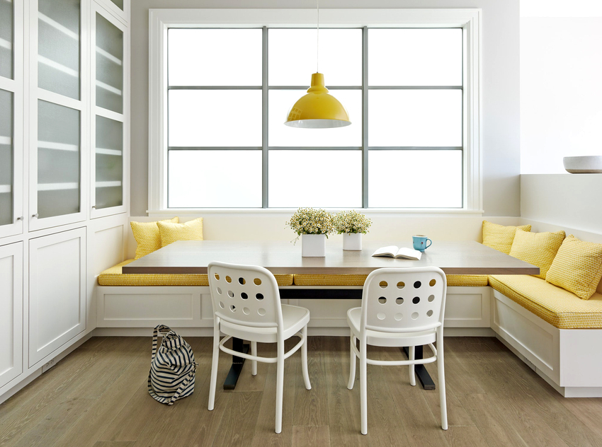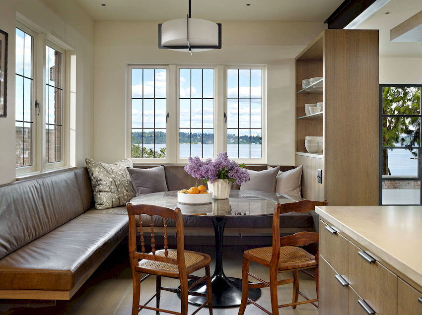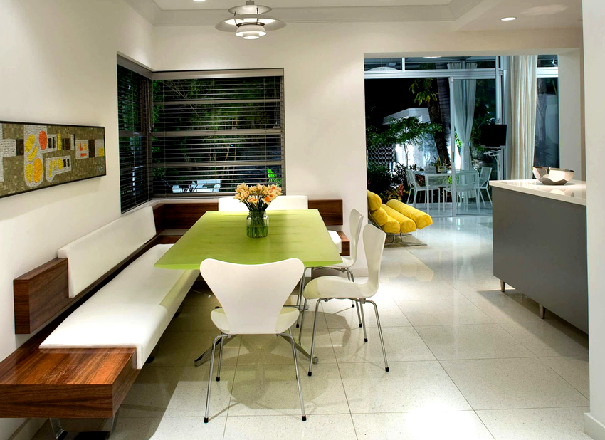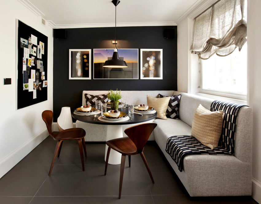 Private houses are characterized by panoramic glazing. It is hard to imagine a better place for a dining area with a sofa than a corner with a large window on the wall. The beautiful view and natural light make your meal a pleasant and relaxing experience.