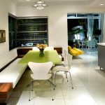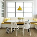 If the design of the bay window has a great depth, you can install a U-shaped corner sofa and a rectangular dining table here. This model allows you to simultaneously accommodate a large number of people.
