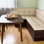 Unlike chairs with upholstered upholstery, these sofas are more comfortable and comfortable. Most often, to save space in the kitchen, corner mini sofas are made with very narrow seating areas. In standard designs, the width of the sitting area is 0.6 m. In compact models, this figure is 0.4 m. Sofas with a universal design that harmoniously fit into any style of kitchen interior are especially popular.
