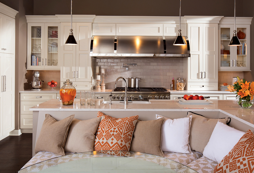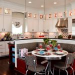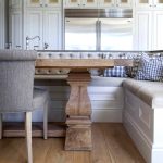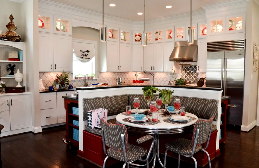 Corner sofas look quite impressive in the photo of kitchens, which go around the table not from two sides, as is usually done, but from three. Such models come in handy in cases where you need to provide a lot of seating. These designs have one drawback. Their installation requires a lot of free space, so three-sided sofas are not suitable for small kitchens.