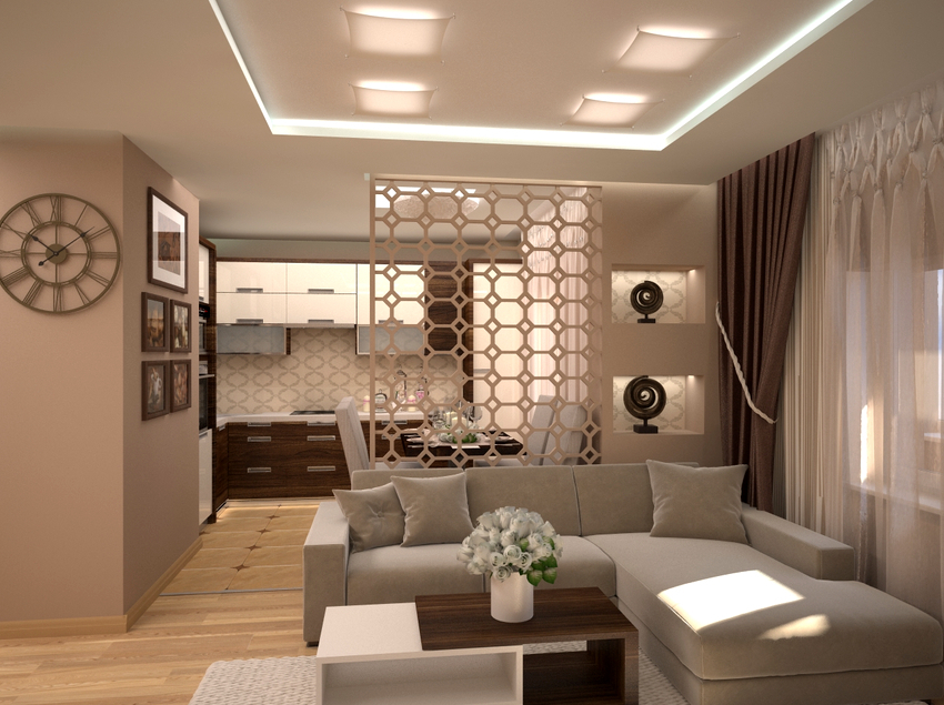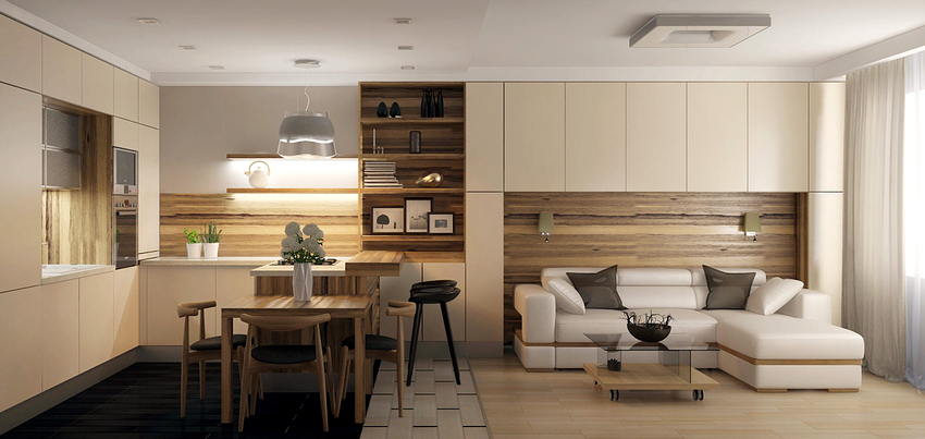 For framing dining furniture and a sofa, you can use an artificial niche formed from cabinets designed for dishes