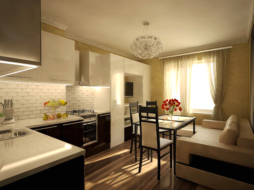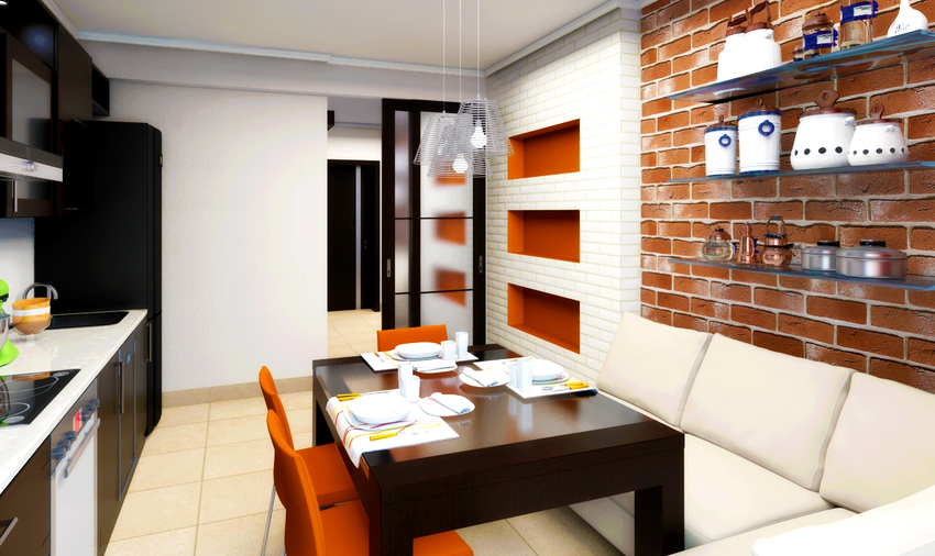 The recreation area is most often organized at one of the walls to the side of the working area or opposite to it. If there is a niche in the design of a kitchen with a corner sofa, then it is better to put this piece of furniture in it. Thus, you can save free space in the kitchen. In a large square room, it is not a sin to install a sofa that will occupy two walls. In this case, the design can be standard or installed on a podium, formed on the basis of pedestals.