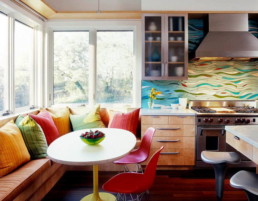 A stylish corner sofa in the kitchen with a variety of colors can be played differently. It is not necessary that the upholstery on the furniture should contrast with the general setting - it can be in harmony with it, for example, repeating one of the shades.