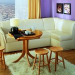 Opposite the working area, you can install a sofa without armrests. Such a design will provide freedom of action without restricting the movement of people who sit at the table or get up from behind it. In this case, the couch will be the most successful option. Typically a pair of upholstered stools are included with the standard models. Thanks to its compact size, this design can be installed in any free corner in the kitchen.