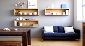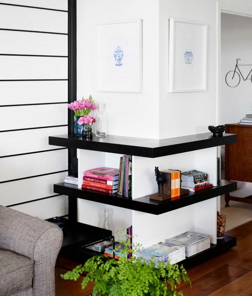 In turn, if the room does not differ in sufficient dimensions, then it is recommended to place the shelves in close proximity to other pieces of furniture. For example, a very popular option is when a structure of this type is mounted above the sofa. The shelf can also be placed near a cabinet or cabinet.