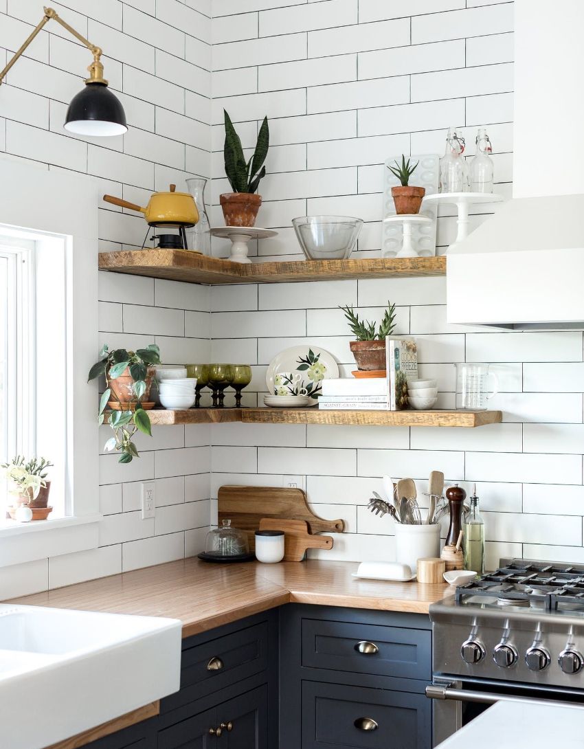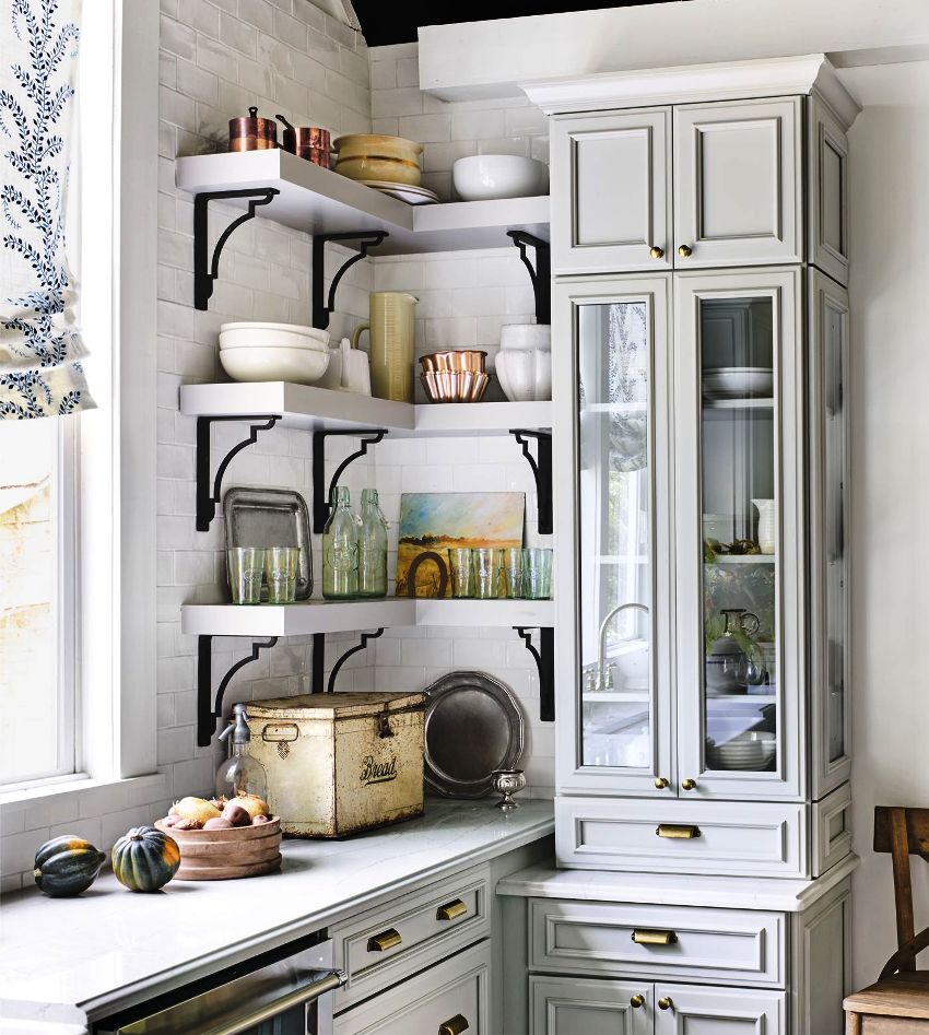 Open shelves offer many advantages over kitchen cabinets. First, less space is required to accommodate such a structure. Secondly, a properly selected shelf allows you to visually expand the space of the room. This is especially true for small kitchens.