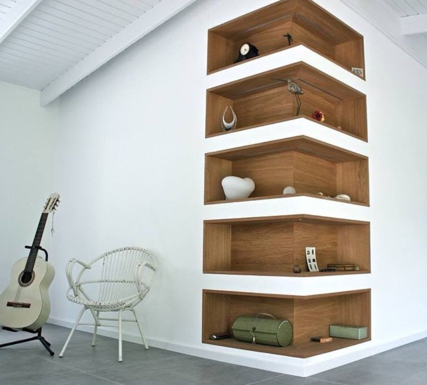 When choosing a material for making a corner shelf, you also need to pay attention to the interior of the room. With this design, you can emphasize the style of the room.