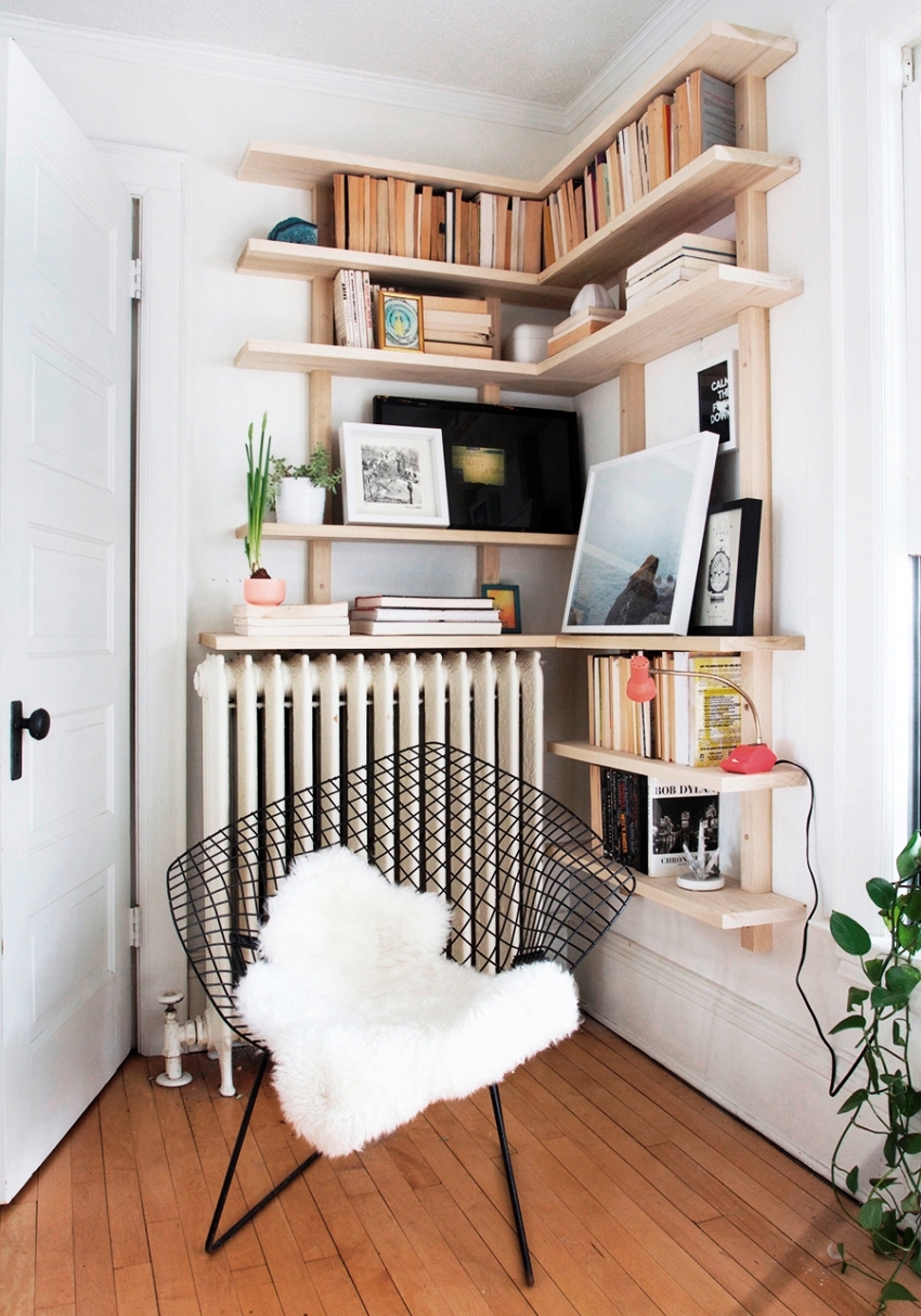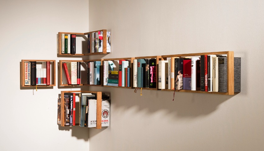 The living room can be equipped with shelves for books. Floor-standing, as well as suspended corner-type structures are easily made with your own hands. However, for this you must have the appropriate set of tools, and you should also read the step-by-step assembly instructions.