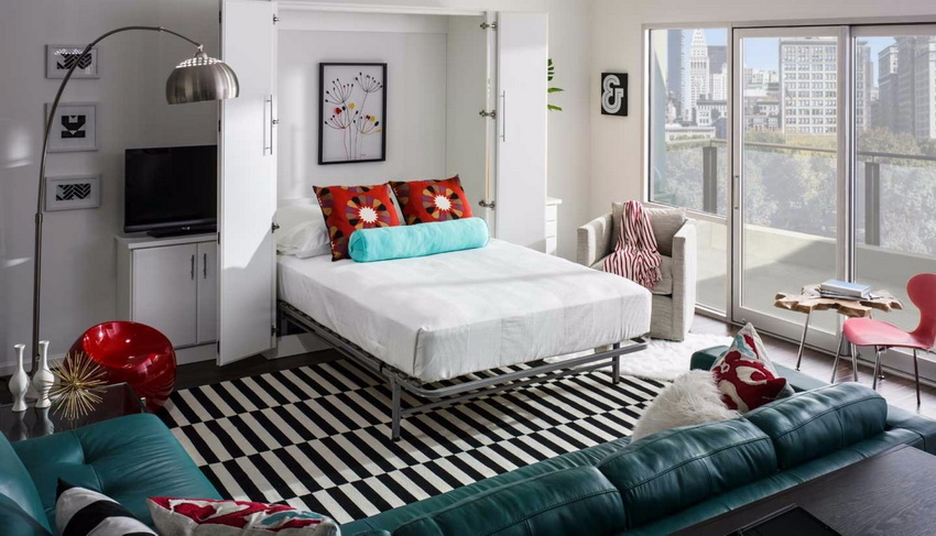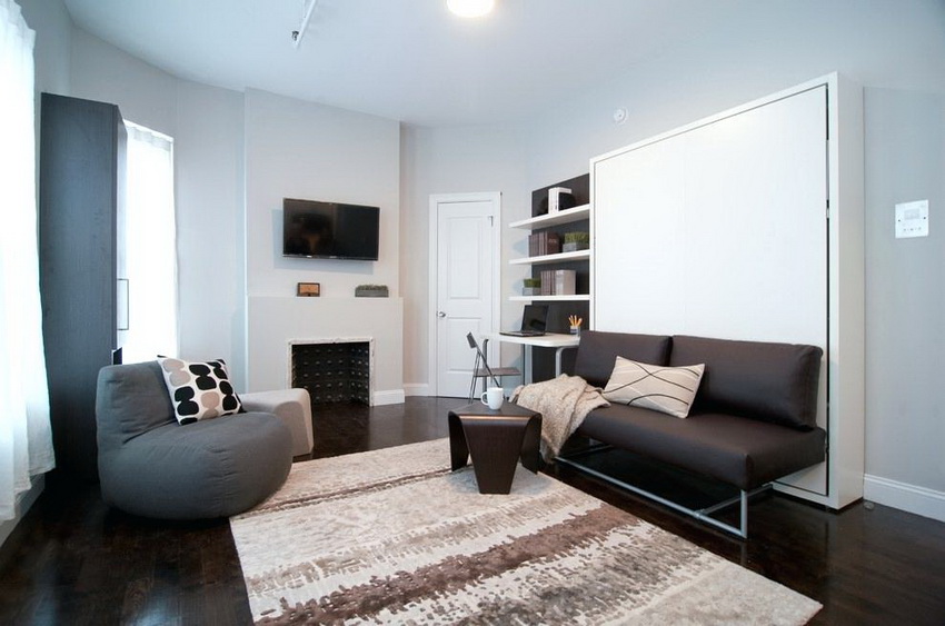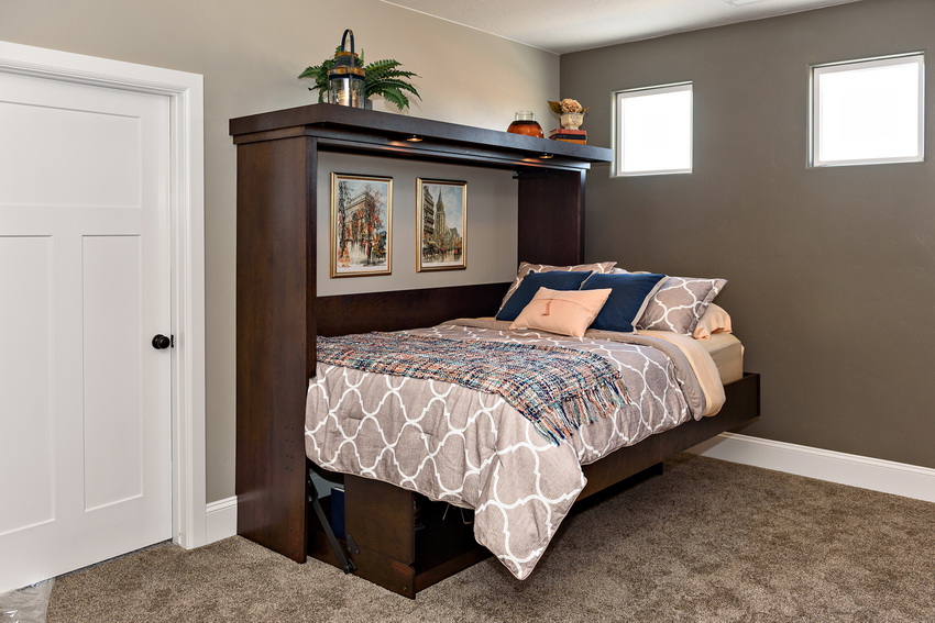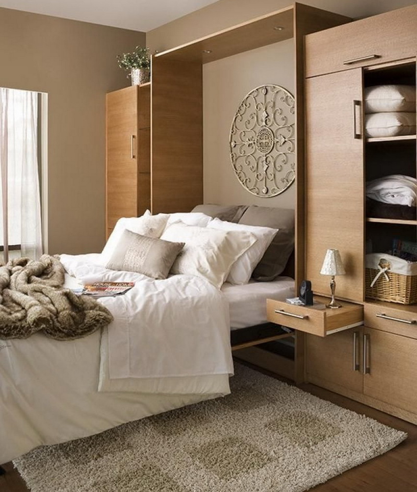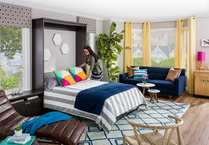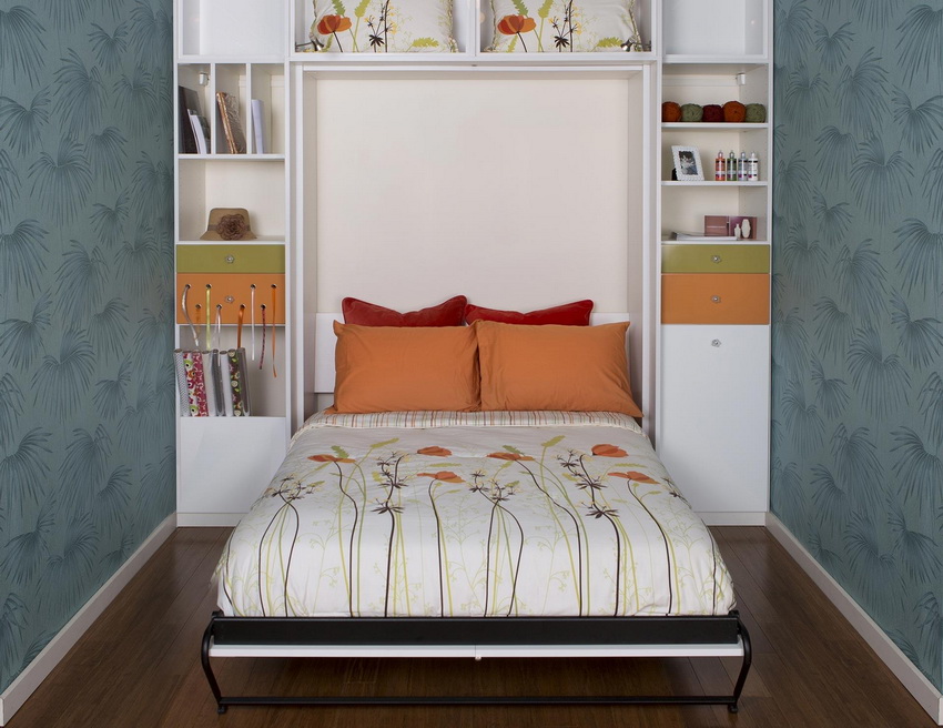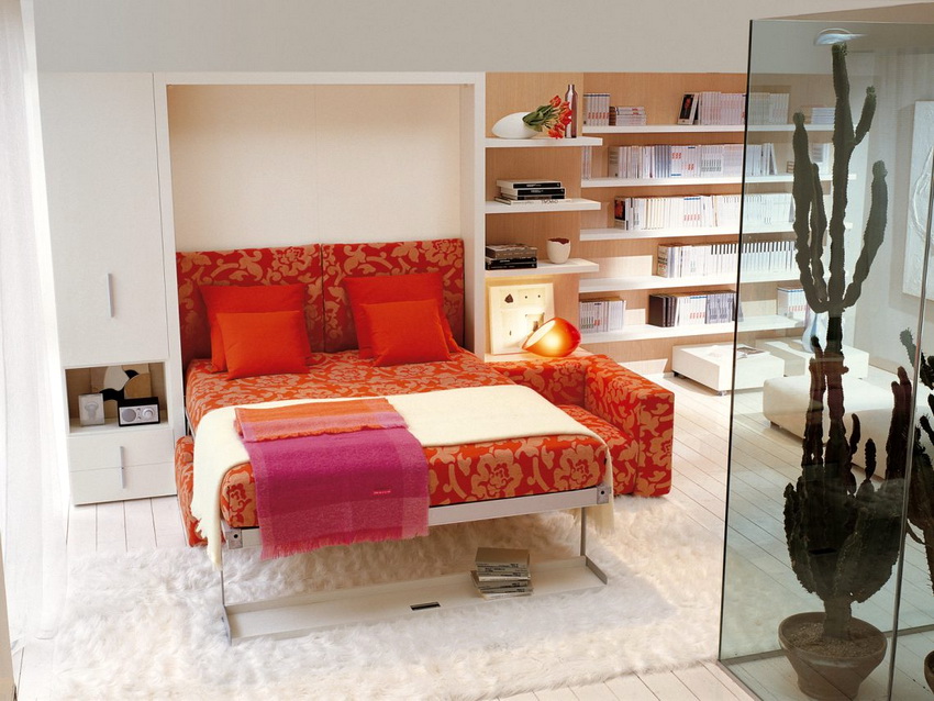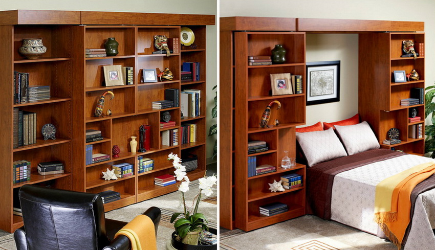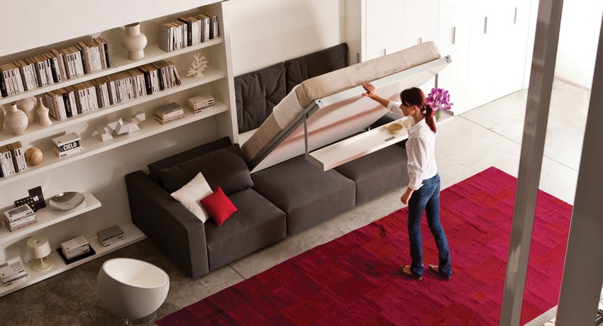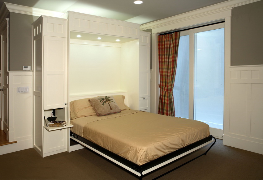 Wardrobes-beds in the interiors of bedrooms look quite interesting in the photo. They are used in cases where the rest room does not have free space for installing a fixed structure. Sometimes convertible beds can be seen in the living room. If the owners of the apartment like to receive guests, this will be a great solution.