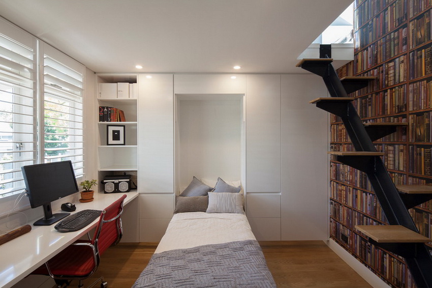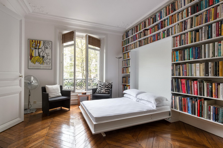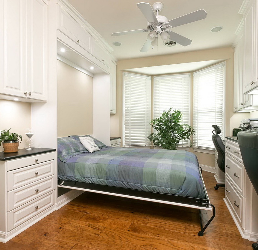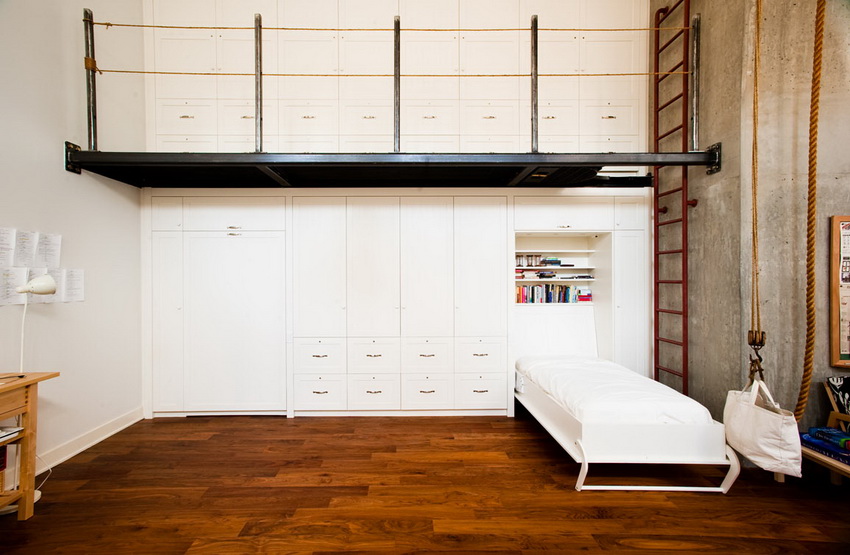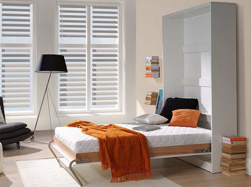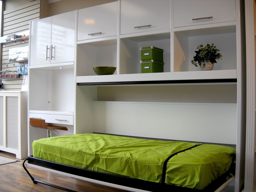 A folding bed built into the wardrobe is an invaluable solution when there is absolutely not enough space in the room