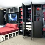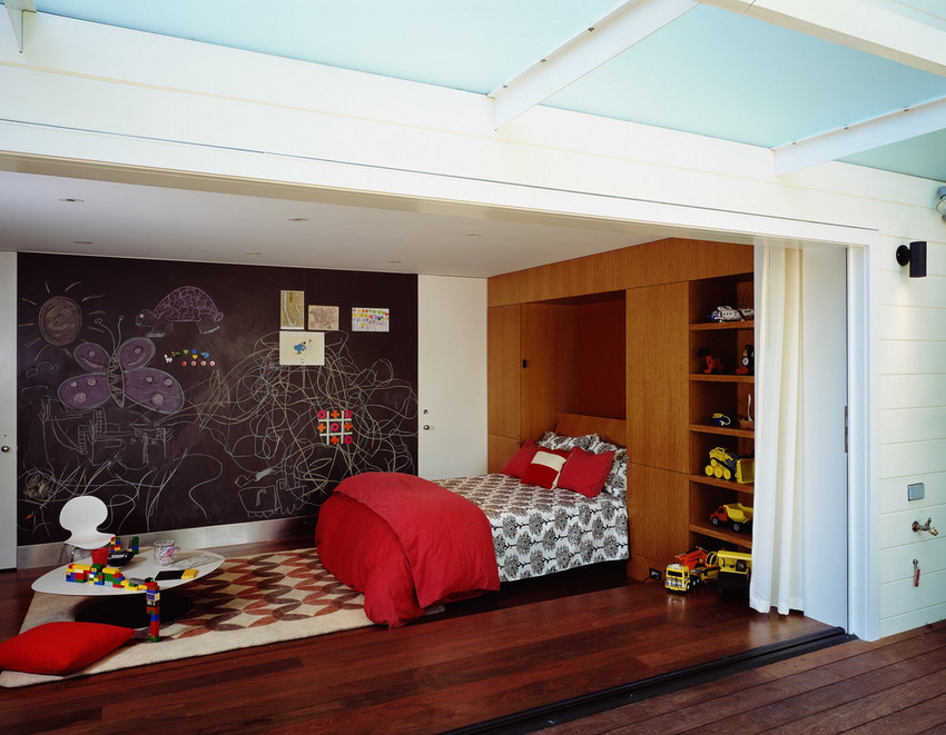 There are models of various configurations on sale. In this case, the cabinet can be placed in headboard or to the side of it. Models of the folding type look interesting, which, when folded, free up space for games. For large rooms, designers develop full-wall designs. They include everything you need, while looking very impressive.