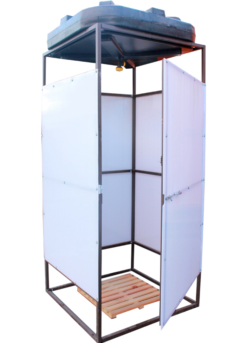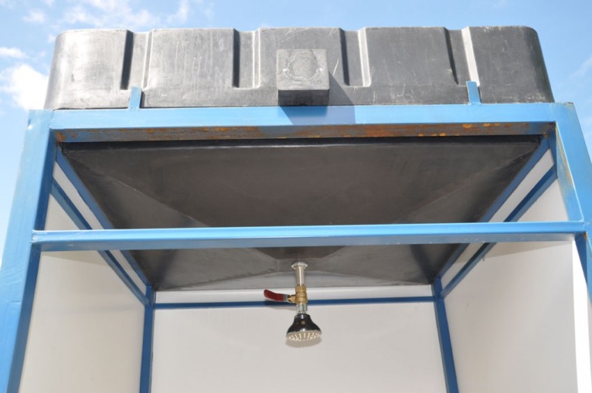 The shower box or stall itself is made of the most suitable materials for this: wood, concrete blocks, plastic or slate on the frame. There should be an overlap on top, but if the tank is planned to be heated with the sun's rays, then it is taken out to the roof. Alternatively, you can place it under a glass panel (instead of a roof) so that the sun's rays can penetrate under it. It is imperative to provide access to the tank for the upcoming cleaning (once a season is enough).