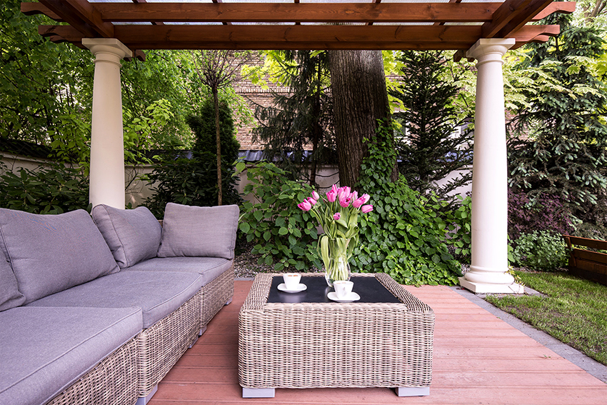 Wide sofas should be in proportion to the size of the pergola, otherwise they will be visually squeezed in. If upholstered furniture is planned, it must be borne in mind that it must be washed. Common polyurethane and PVC emit an unpleasant odor when heated. Bamboo furniture is suitable for open conditions, but it is expensive, so not everyone has the opportunity to buy it.