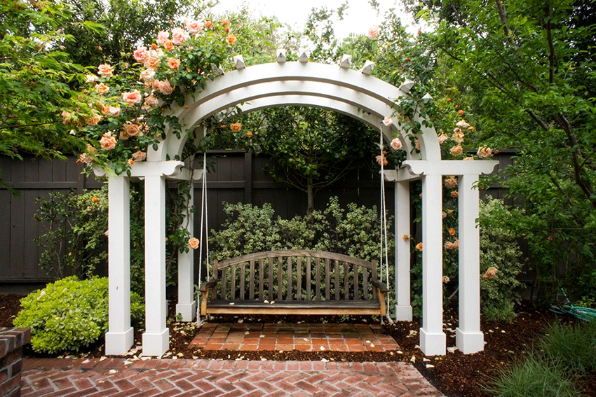 Even if the main purpose of creating a pergola was to support climbing plants, then leaving the interior part non-functional is not worth it. With an area of 3-4 m² and a height of 1.5-2 m, you can place a swing or a bench - you get a cozy shaded corner where you can read in solitude or just relax.