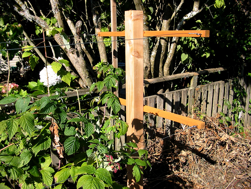 - A single-strip trellis consists of small posts with a single wire stretched that provides support to the raspberry branches on one side. Each branch is attached to the wire separately. This mounting method is suitable for small areas of the raspberry tree.