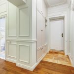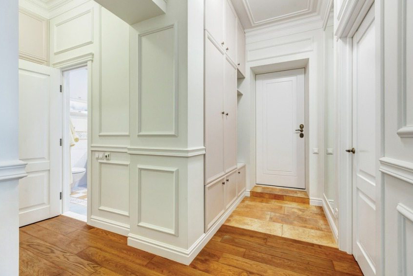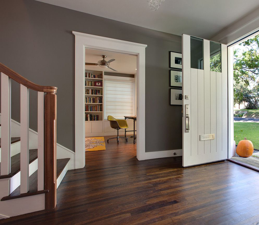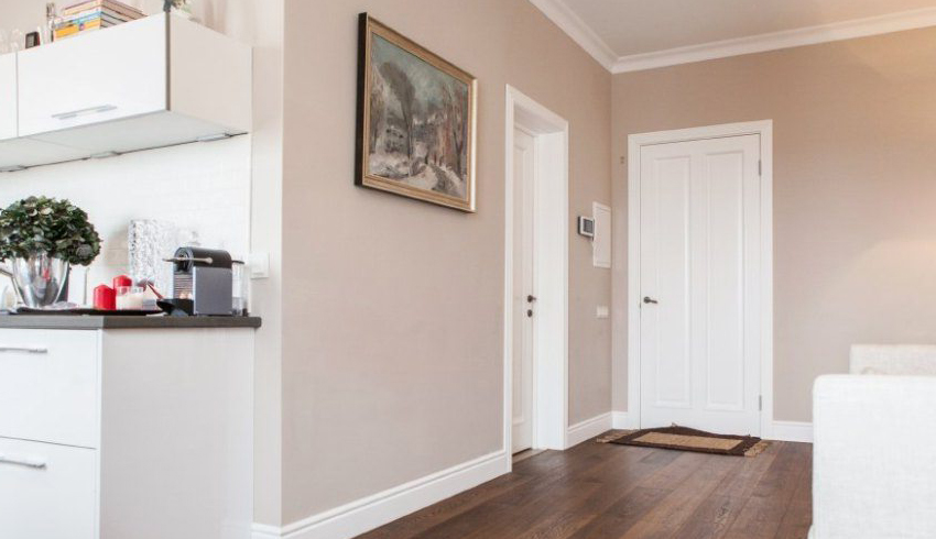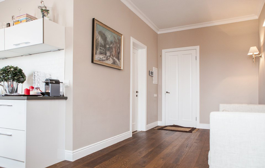White doors look quite impressive in interiors with dark wooden floors.A beautiful addition to this design will be platbands, made to match the flooring. Using these elements will create an accent around the light door.