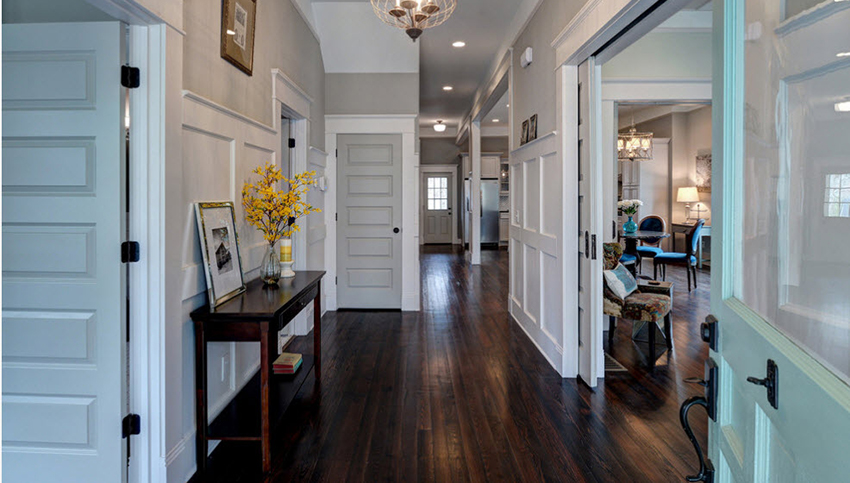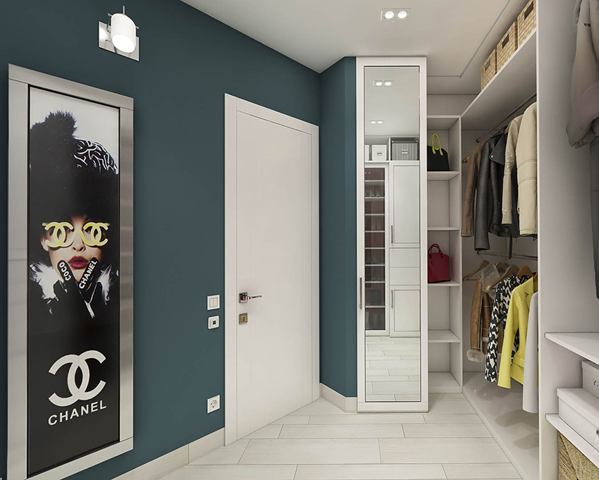 To create an atmosphere of calm and freshness, we recommend using a blue finish. The combination of cool walls and a clean white door is the only option that works for interiors in blue. A similar design is usually used in classic styles. In this case, a white door will be well complemented by an imitation of panel trim. For this, frames made from moldings can be used.