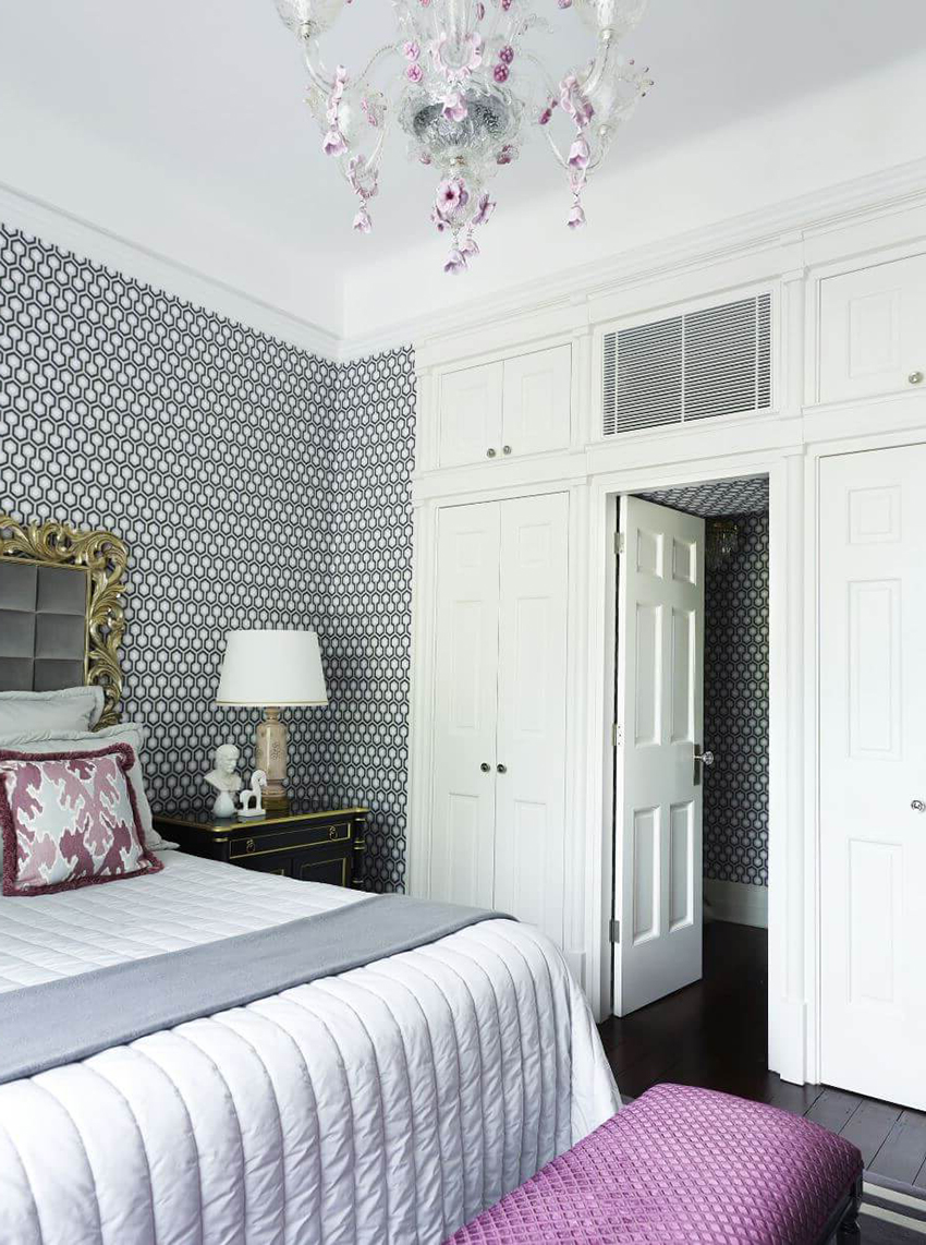 The combination of white doors and purple walls is used to create a luxurious and stately setting. The purple color is rich in saturation, it is difficult for the human psyche, and therefore can cause a rapid depletion of the nervous system. As a result, this situation will only be depressing. The presence of white doors in such an interior negates this negative effect.