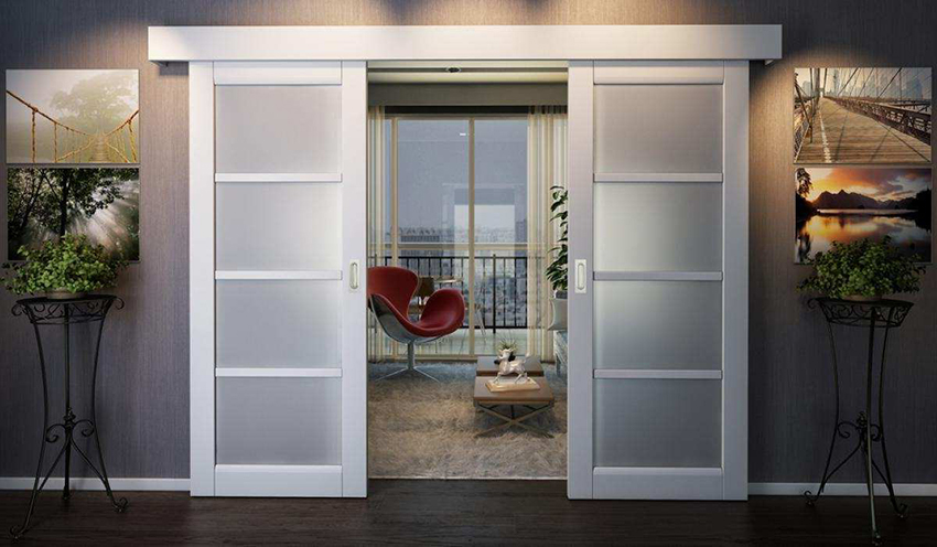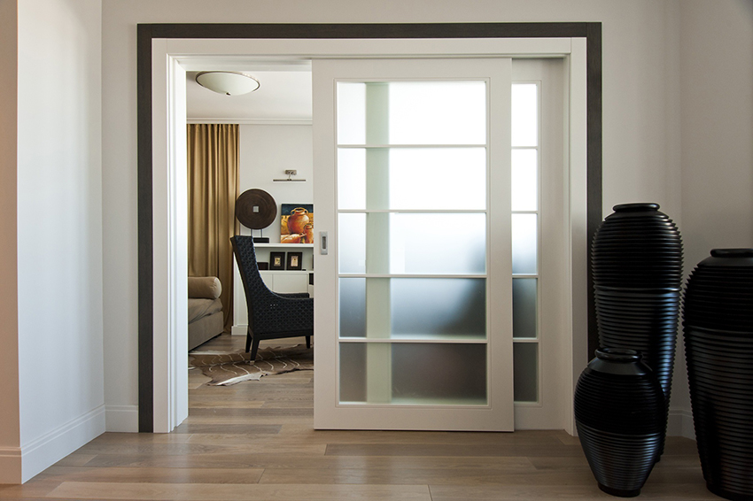 Door designs with a glossy surface will look perfect in the living room interior. These models are also used in office spaces, banquet rooms and salons.