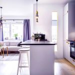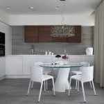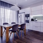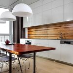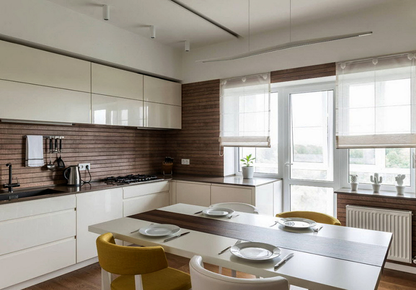 - Combined. If we are talking about a modern design of curtains for a kitchen with a balcony door, then you can use products of different lengths: a short curtain covers the window area, and a long one is hung on the plane of the balcony door. The best option is roller, Roman or Austrian curtains, which do not fly apart under the influence of a draft.