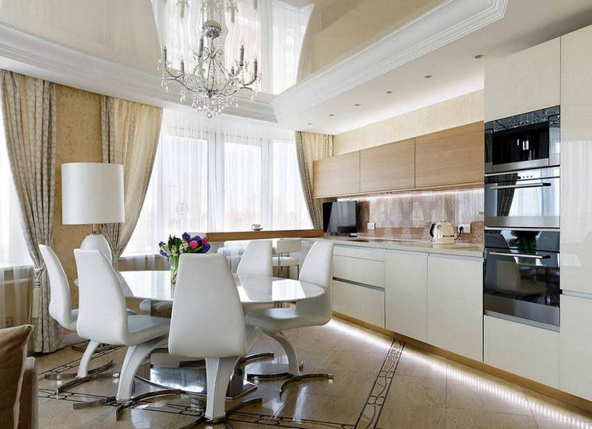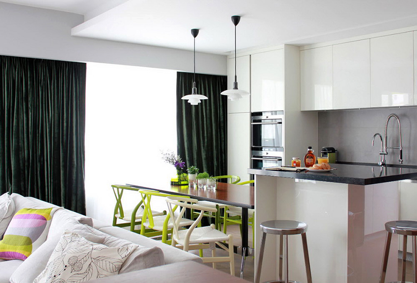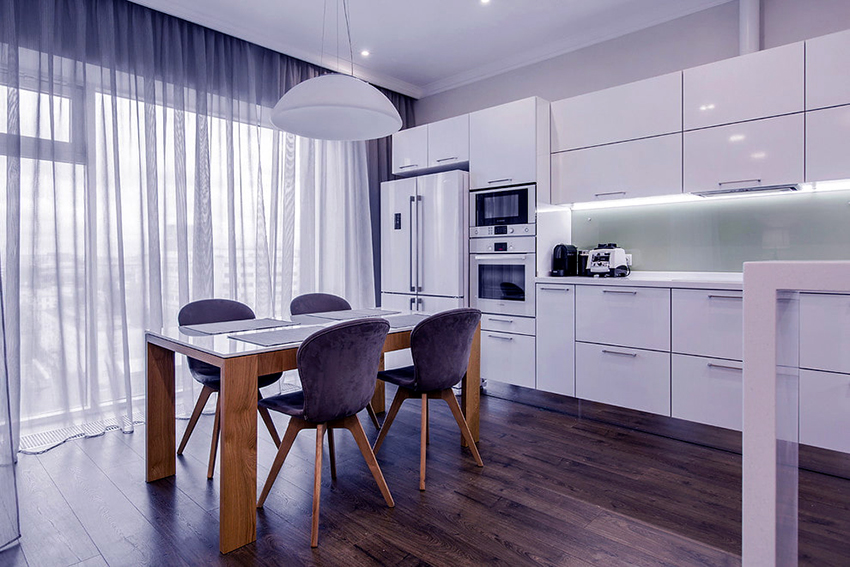 - White. Another versatile color that can fit into any interior. White curtains to the ceiling can visually increase the height of the walls, but because of the soiled, this option is not recommended for use in the kitchen.