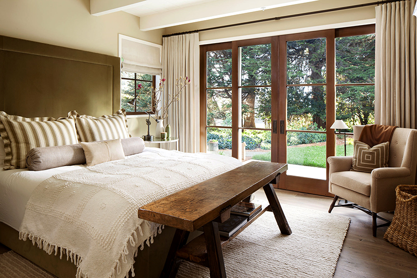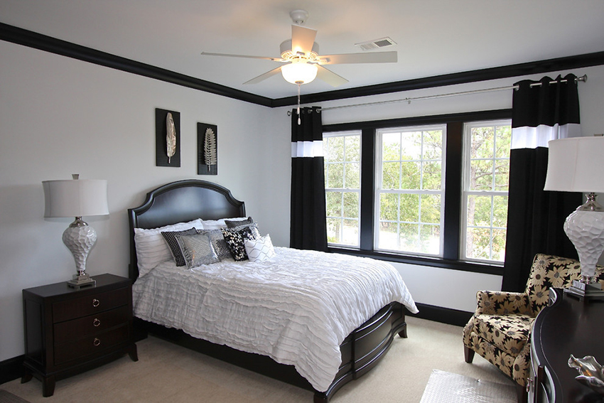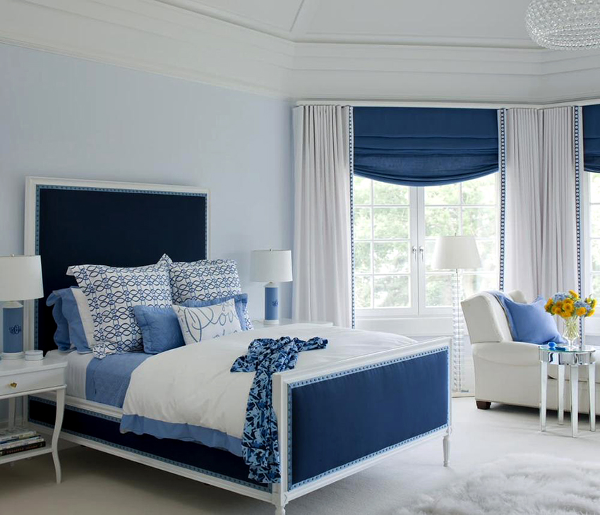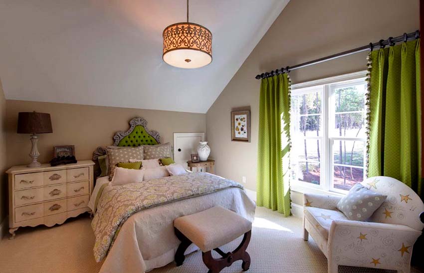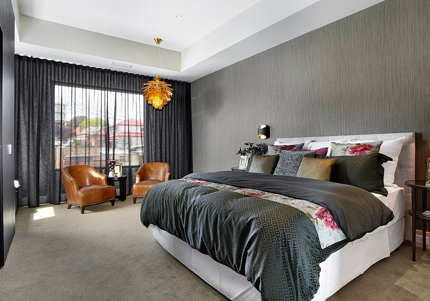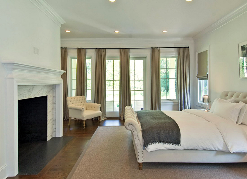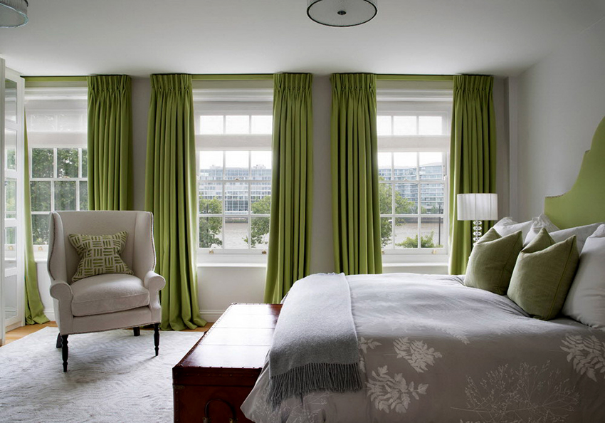 In a large bedroom, you can choose curtains of any design and volume, the main thing is that they harmoniously fit into the surrounding interior. When choosing a color, preference is given to light and natural shades that have a calming effect. The curtains in the bedroom in color and pattern can match the design of the bedding.