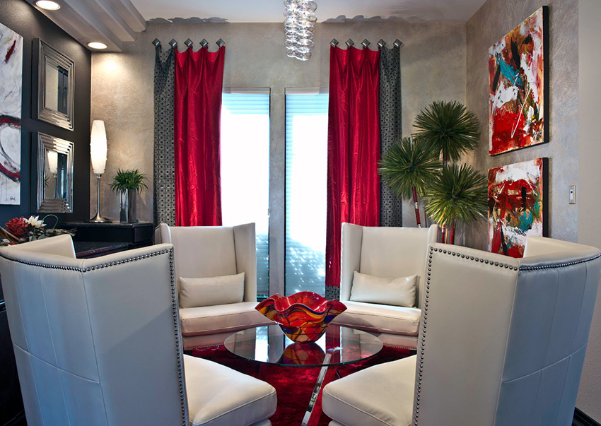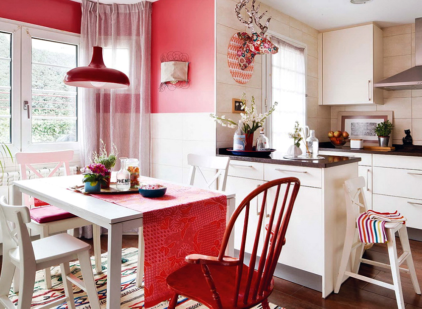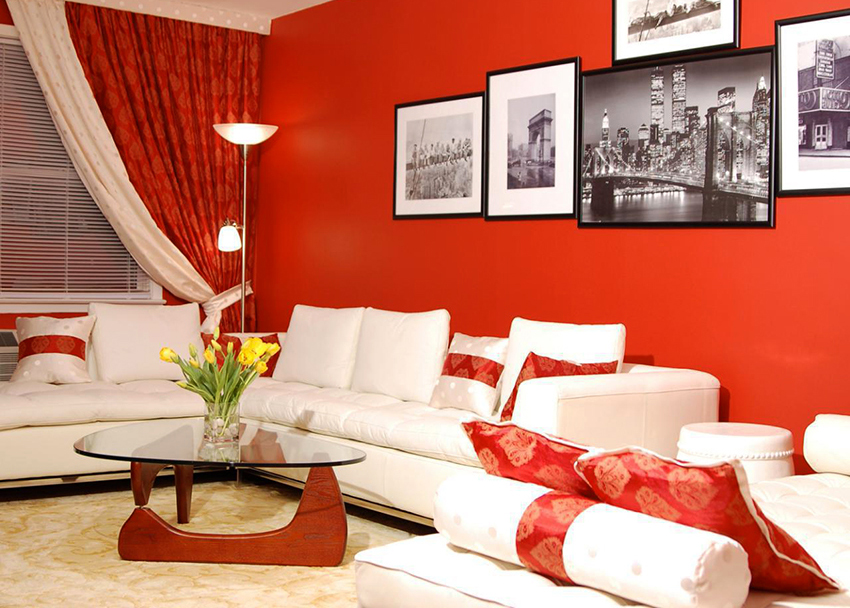 - Red. An energetic color that suits bold interiors. It is required to use it in dosage, you should not choose overly bright options that will irritate over time.