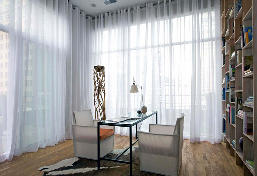 - Organza. A blended fabric using cotton and rayon. In the photo, the organza looks weightless and laconic. Organza curtains can be used as an independent element or serve as an additional decor in combination with Roman, roller blinds or blinds.