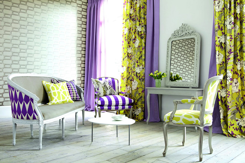 - Provence. Lightweight linen or chintz fabrics will do. Primary colors: olive, lavender, blue.