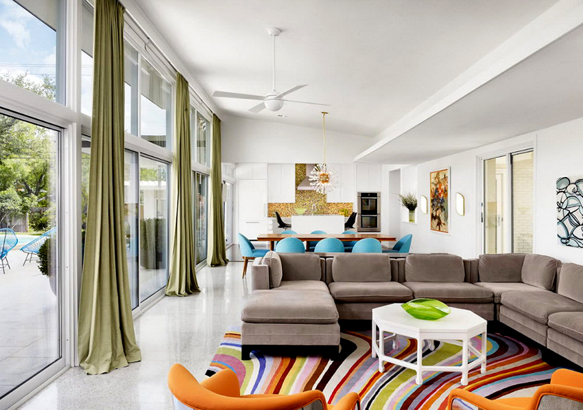Choosing modern curtains for the living room, they increasingly prefer not only light neutral tones, but also bright shades that give the room individuality. Orange, yellow, pink, blue, plum and chocolate colors are great for the living room. Translucent white curtains are considered versatile; they are suitable for decorating a living room decorated in any style.