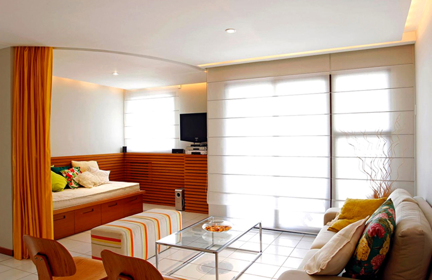- In a room that has a small area, for a visual increase in volume, it is recommended to give preference to light curtains without large patterns. It is better to choose monochromatic products or with a small, unobtrusive print.