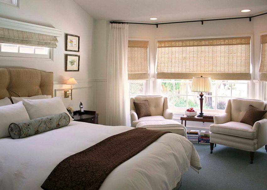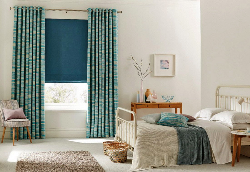 In a small bedroom, it is undesirable to hang too massive curtains, which will visually reduce the area of an already small room. If the room is abundantly lit or is on the ground floor, you can use combined options. For example, roller or roman blinds can be placed directly in the plane of the window, and it is recommended to fix light and beautiful organza curtains over them.