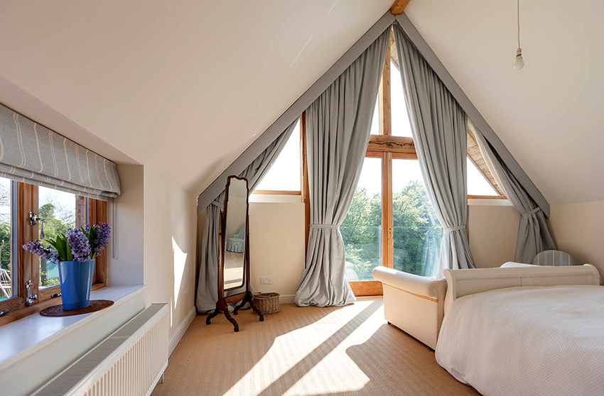 The most careful approach is to choose curtains for small, low-set windows, which are often found in bunk apartments. In such a situation, it is recommended to select products whose width will exceed the width of the window opening. It is recommended to fix the curtain with a ceiling cornice in order to "raise" the ceiling as much as possible.