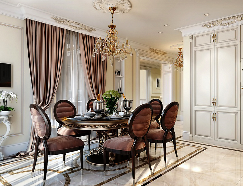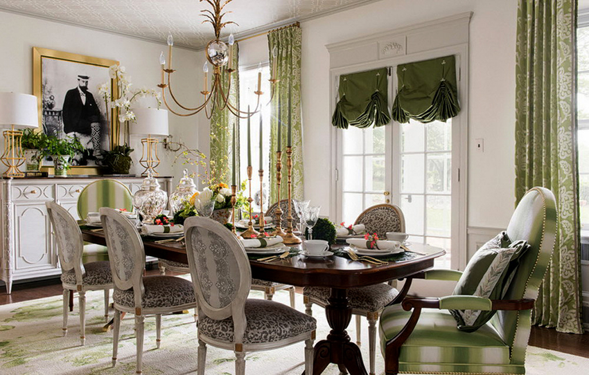 - Empire style. Curtains should be abundantly draped and decorated with lambrequins. Silk, fringe and velvet are mainly used.