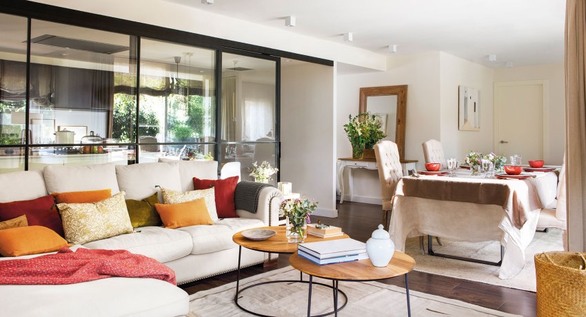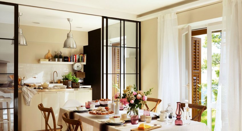 With the help of sliding systems made of glass, you can separate the working area from the bedroom or living room, without taking away the useful area from the room. The living room and dining room or kitchen is designed in the same way.