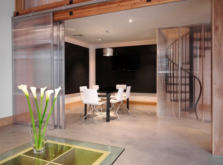 Helpful advice! The division of space with glass sliding doors can be used to create a modern open space layout. In the interior of the premises, such structures are practically invisible. Most of the time, their doors can be kept open.