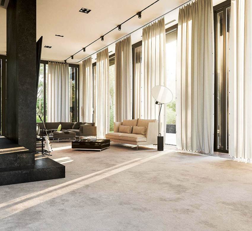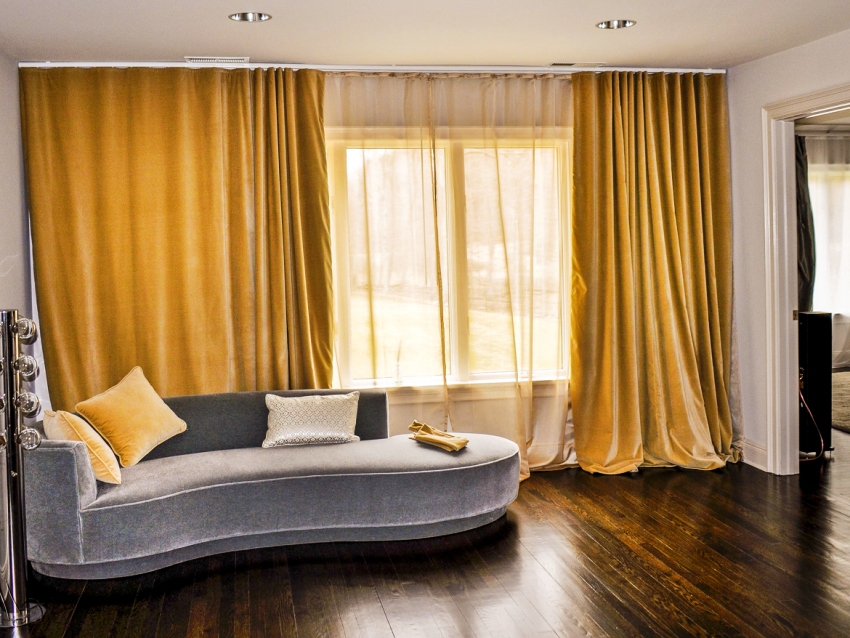 Considering the types of curtains, you should pay special attention to aluminum cornices, which are durable and reliable. The material is used for ceiling structures. The products have a minimum thickness, which allows them to be hidden in a false ceiling structure or hidden under a skirting board. Such a cornice is able to withstand significant weight without undergoing deformational changes. You can hang curtains of any material with heavy lush draperies on it. Products can be made in silver, gold, bronze or black, as shown in the photo of the ceiling curtains.