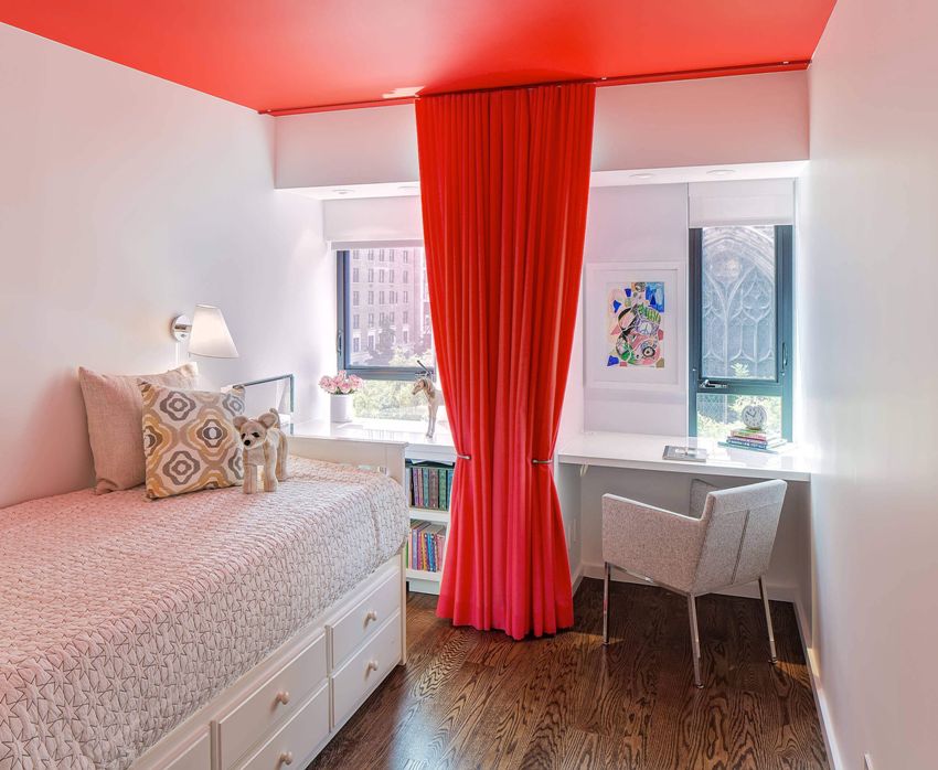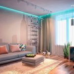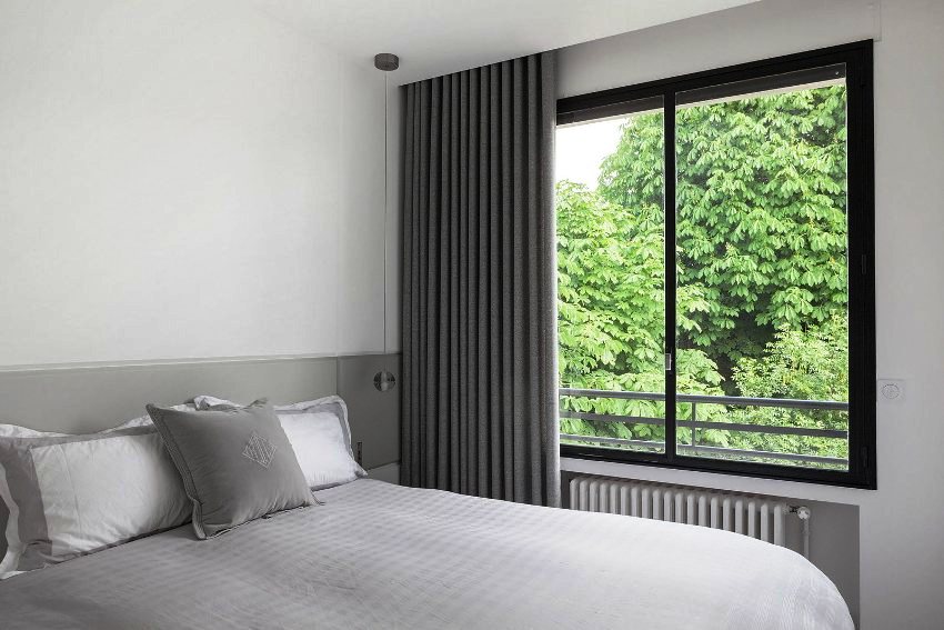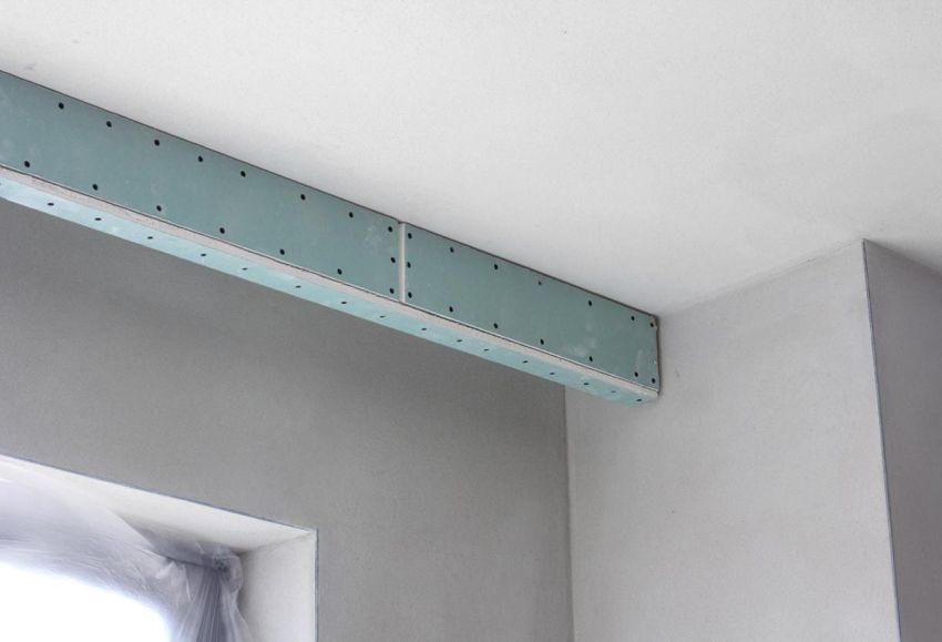 In the case of organizing a false ceiling, you should consider in advance the place for attaching the curtain cloth. There are two mounting options: open and closed. If you leave a small niche between the wall and the suspended ceiling, you can organize the hidden fastening of the curtain directly to the concrete ceiling. Another method involves the installation of an embedded part in the form of a wooden bar or a metal profile at the planned location of the curtain attachment. After the installation of the suspended ceiling, the structure is fixed to the embedded element through the drywall.