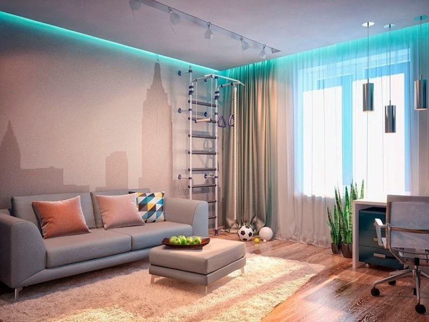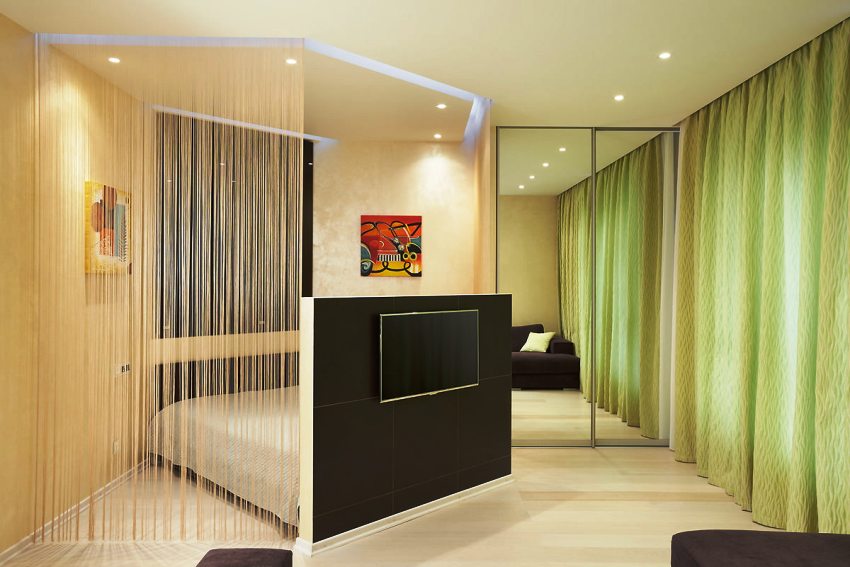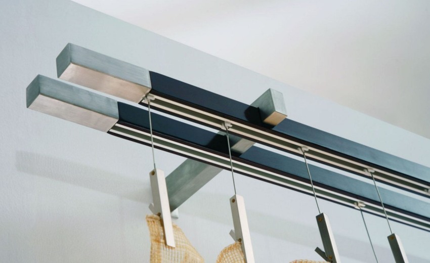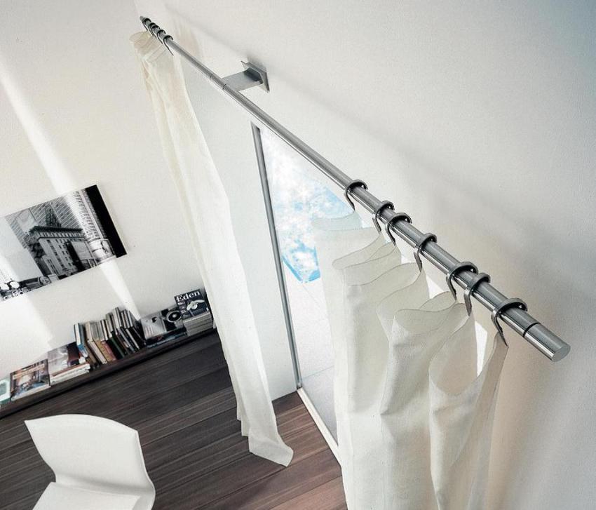 String curtains are represented by two brackets, equipped with special devices for stringing the strings, which are a metal cable that can withstand a lot of weight.Such a minimalist and modern version of wall curtains can give a room the necessary charm. This product will ideally fit into modern, hi-tech and minimalism. The disadvantage of such cornices is the likelihood of loosening under the heavy weight of the devices that fix the cable, which will entail sagging of the entire structure.