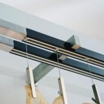The first option assumes the following sequence of actions. Before the installation of the stretch ceiling, marking is performed under the embedded beam, which is then fixed to the base ceiling. Then a profile guide for the web is installed. After installing the tensioning structure, the curtain is attached to it with dowel-nails through the PVC sheet. It is better to burn through the holes for fasteners. They should not be punctured or broken through, as this may compromise the integrity of the coating. In places where nails pass, it is necessary to install polymer gaskets.