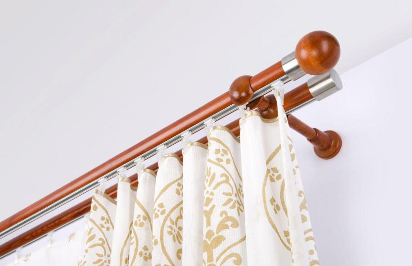 Wooden curtains for curtains give the room a regal majestic look. They can be tubular or baguette. Structures can withstand significant weight. They are harmoniously combined with classic heavy curtains made of solid noble fabrics like jacquard, brocade, tapestry. Despite their massiveness, the products are able to emphasize the elegance of light flowing curtains. This is a good option for any interior, where natural wood furniture, parquet or parquet flooring, wood panels and other decorative elements made of wood are used to decorate the room.