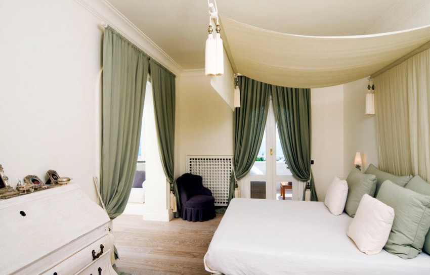 Ceiling curtain rods are installed using various decorative elements to hide the fastening mechanism itself and make the room even more attractive