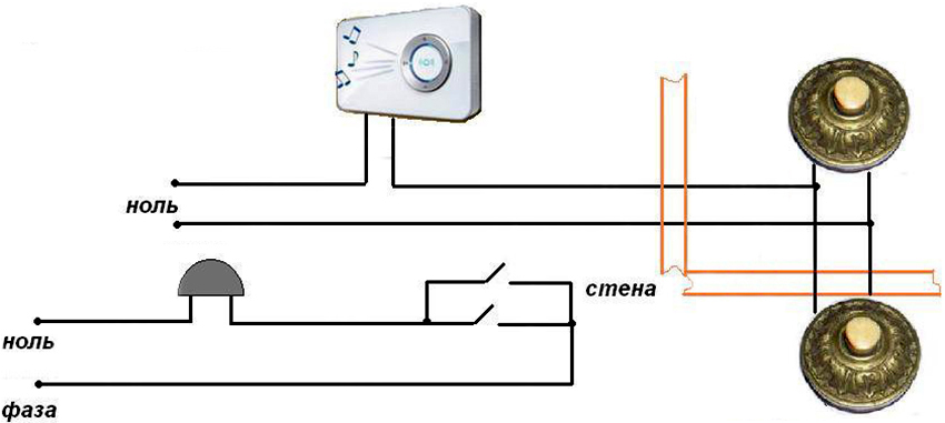 In practice, there are cases when it is necessary to install two buttons on one bell or two main units. The first option is implemented by means of parallel connection of bell buttons in apartments. The installation diagram clearly shows this. The phase is fed to the first button, from where the cable is diverted to the second button. From it, from the second free contact, a conductor enters the same input of the first key, from where it goes to the main bell unit.