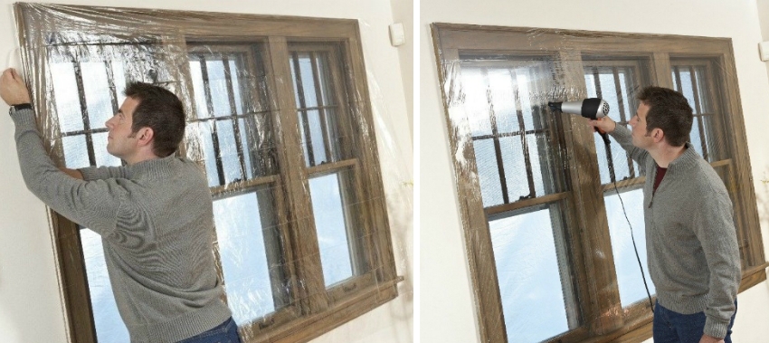The process of insulating a wooden window with a plastic film