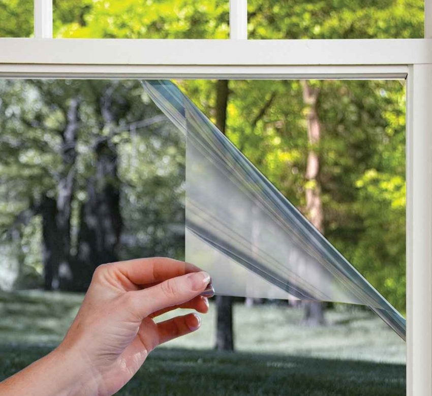A piece of such a film of a suitable size is stretched from the outside of the house, not forgetting about small allowances. Using a conventional spray bottle, a soapy solution is applied to the surface of the window glass, after which the film is simply glued.